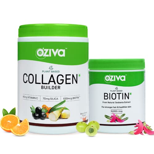 OZiva Plant Based Collagen Builder Powder (With Vitamin C) Berry Orange,250G & Plant Based Biotin 10000+ Mcg (With Natural Sesbania Agati Extract) For Stronger Hair & Healthier Skin,125G(Combo Pack)