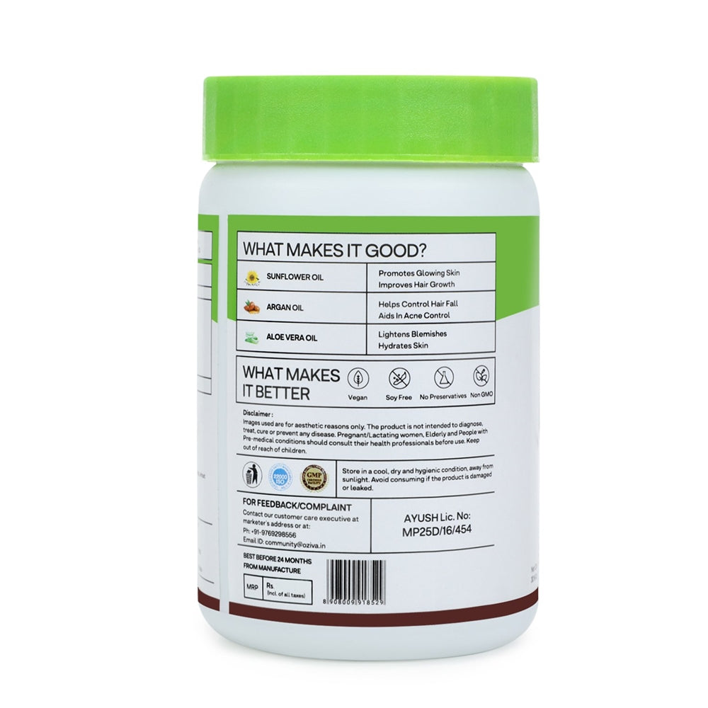 OZiva Plant Based Natural Vitamin E (With Argan oil + Aloe vera) -30 Cap:It is useful for glowing skin & strong hair. It may help repair dry scalp, improve hair texture & supports shining hair, reduces acne, dark spots & blemishes.Soy freeGluten freeNon GMONo sugarNo trans fatLactose freeNo preservativesNo artificial sweetenersIngredients:Sunflower OilArgan OilAloe VeraManufacturer: OZivaQuantity: 30 CapsulesNote: May contain additional ingredients. The product description is for information purposes only and it is always better to consume/use products after reading the labels on the products or as prescribed by the physician.Legal Disclaimer: Statements regarding dietary supplements have not