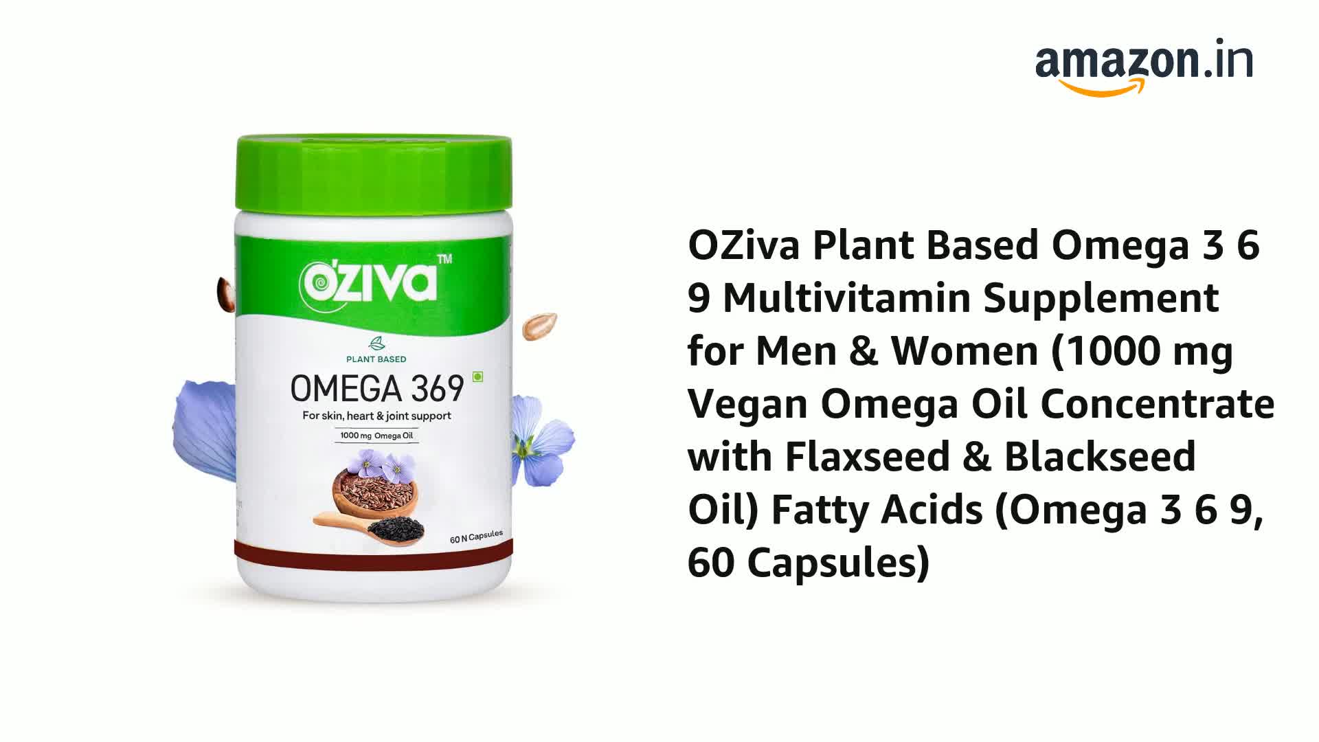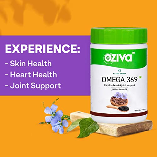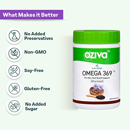 OZiva Plant Based Omega 3 6 9 Multivitamin Supplement for Men & Women (1000 mg Vegan Omega Oil Concentrate with Flaxseed & Blackseed Oil) Fatty Acids (Omega 3 6 9, 60 Capsules)