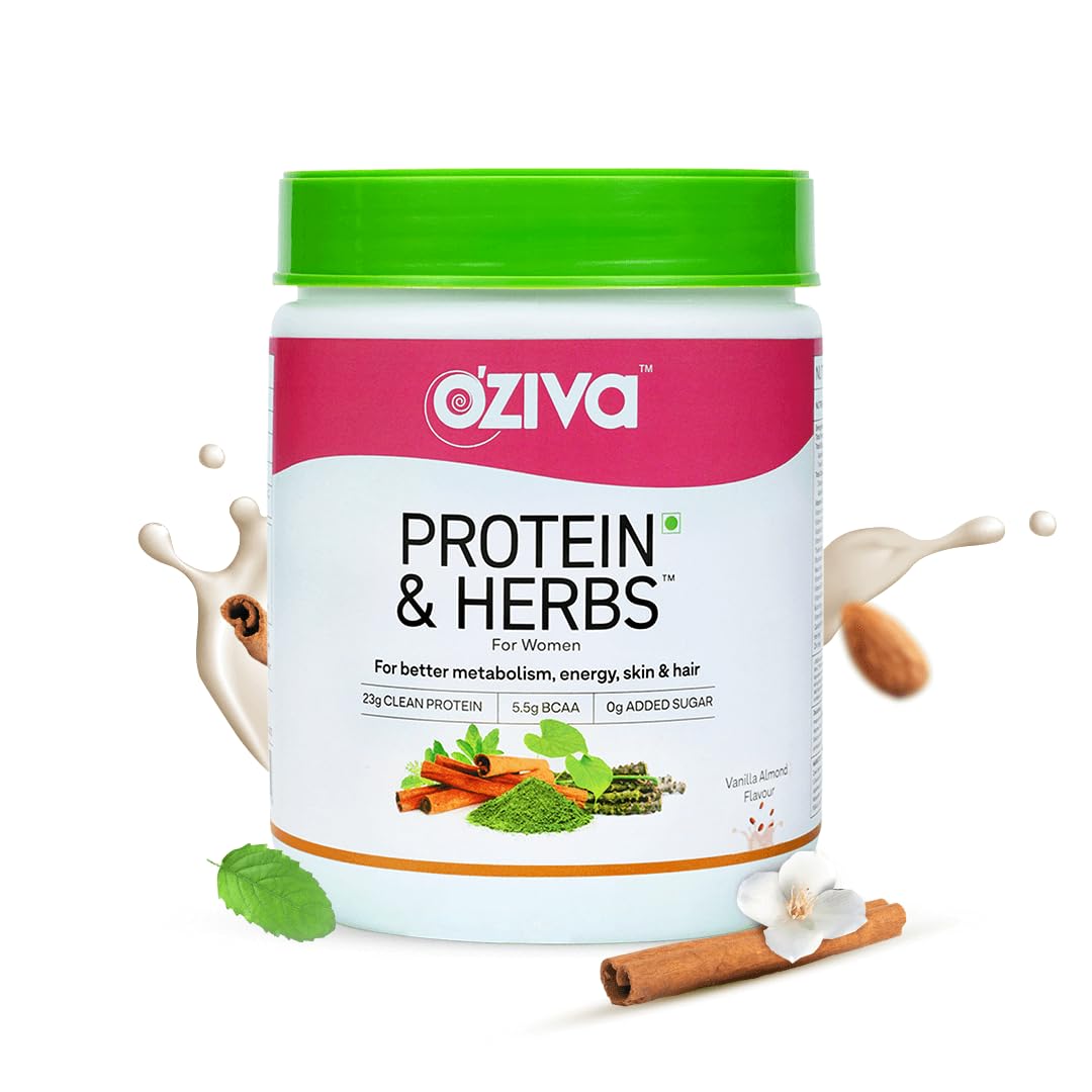 OZiva Protein & Herbs Women (Natural Protein Powder with Ayurvedic Herbs like Shatavari Giloy Curcumin & Multivitamins for Boosting Energy Skin & Hair (Vanilla Almond 500g)