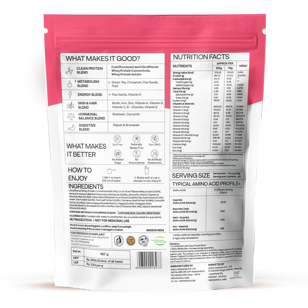 • Whey Protein Powder for Women’s Weight Control: OZiva Protein & Herbs for Women helps increase your energy levels reduce fat percentage & ease your post-workout muscle soreness with Clean Protein Blend including 23g of cold processed whey protein concen