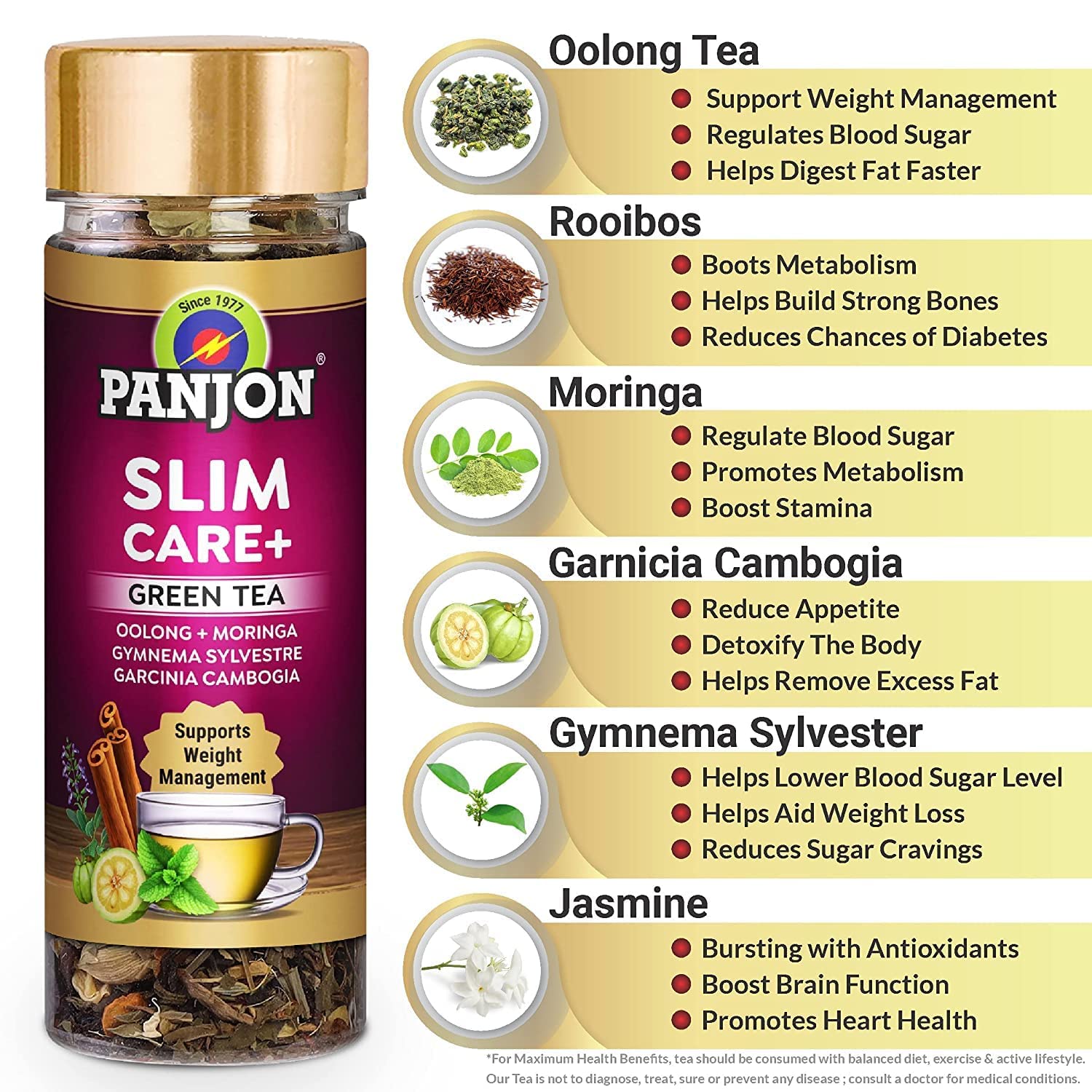 TRUST SINCE 1977 : Panjon Health Care Experts since 1977 present Slim Care Green Tea For Weight Loss with Oolong Moringa Lemongrass Garcinia Cambogia Rooibos Gymnema Sylvestre Jasmine with the perfect balance of rich taste and irresistible Aroma to help R