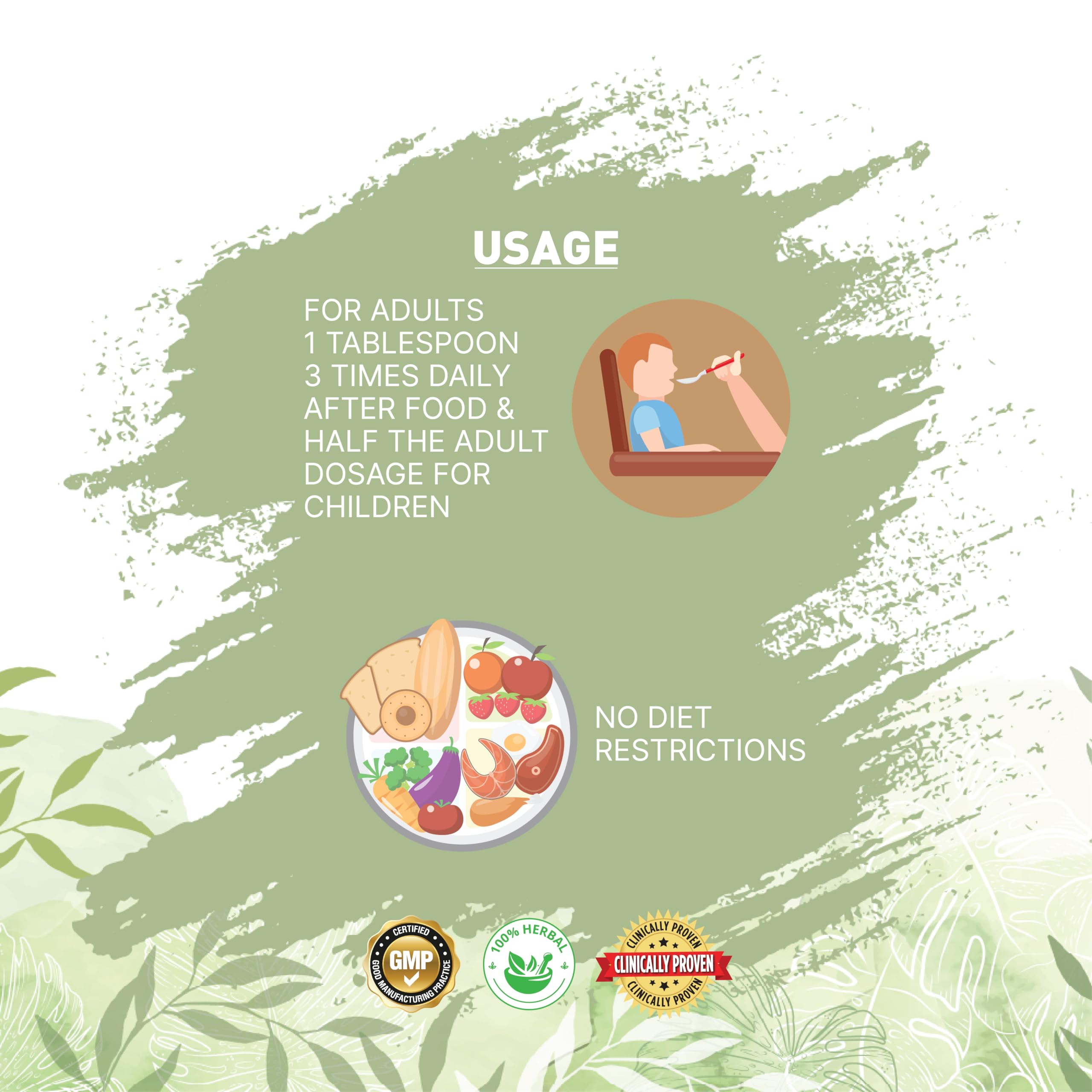 • Dosage: Adults 1 spoon (15 ml) three times daily after food Children- Half the adult dosage.