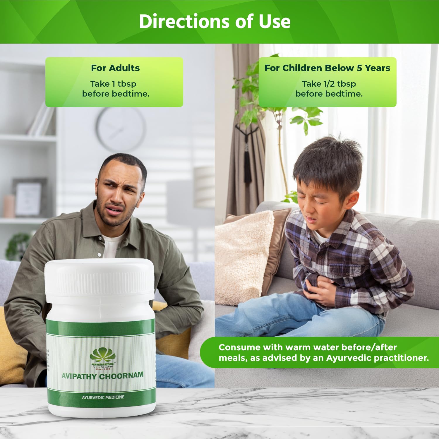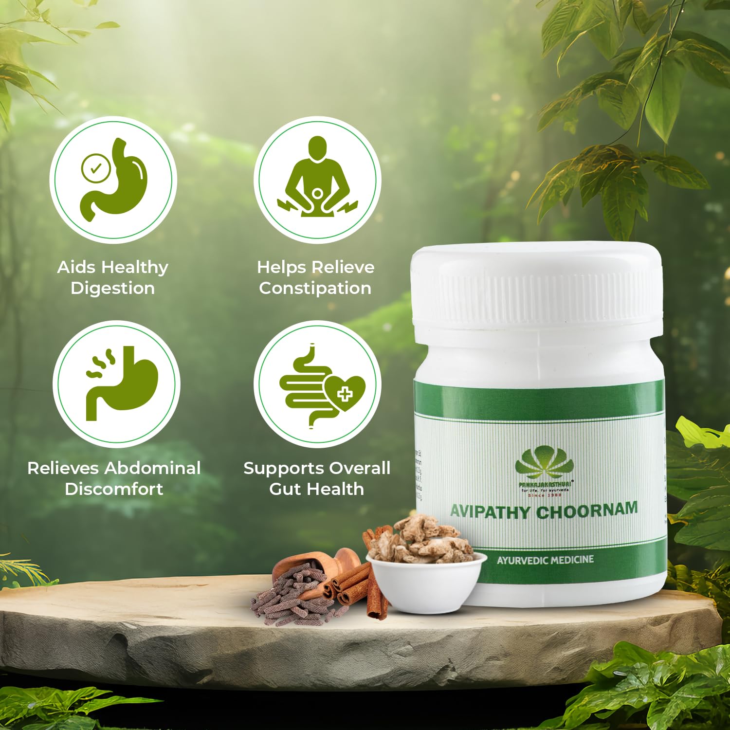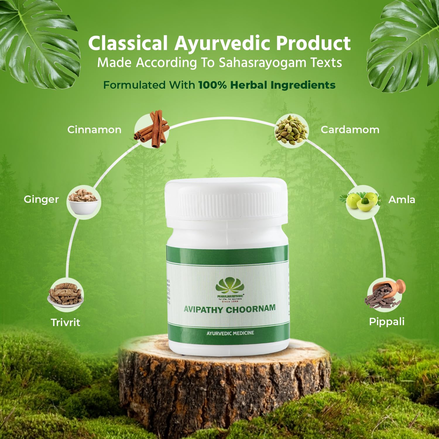 Avipathy Choornam is a traditional Ayurvedic herbal powder formulation renowned for its gentle yet effective purgative properties. This 20-gram pack contains a carefully crafted blend of herbs that work harmoniously to provide relief from constipation. The formulation is particularly beneficial for managing Pitha-related conditions including various liver disorders. This classical Ayurvedic preparation offers a natural approach to maintaining digestive health. The powder form makes it convenient to measure and consume as per the physician's guidance. While being potent in its action Avipathy Choornam is known for its balanced approach to digestive wellness. It's important to note that the dosage should be strictly followed as prescribed by your Ayurvedic physician for optimal results. The powder comes in a well-sealed package to maintain its authenticity and efficacy.