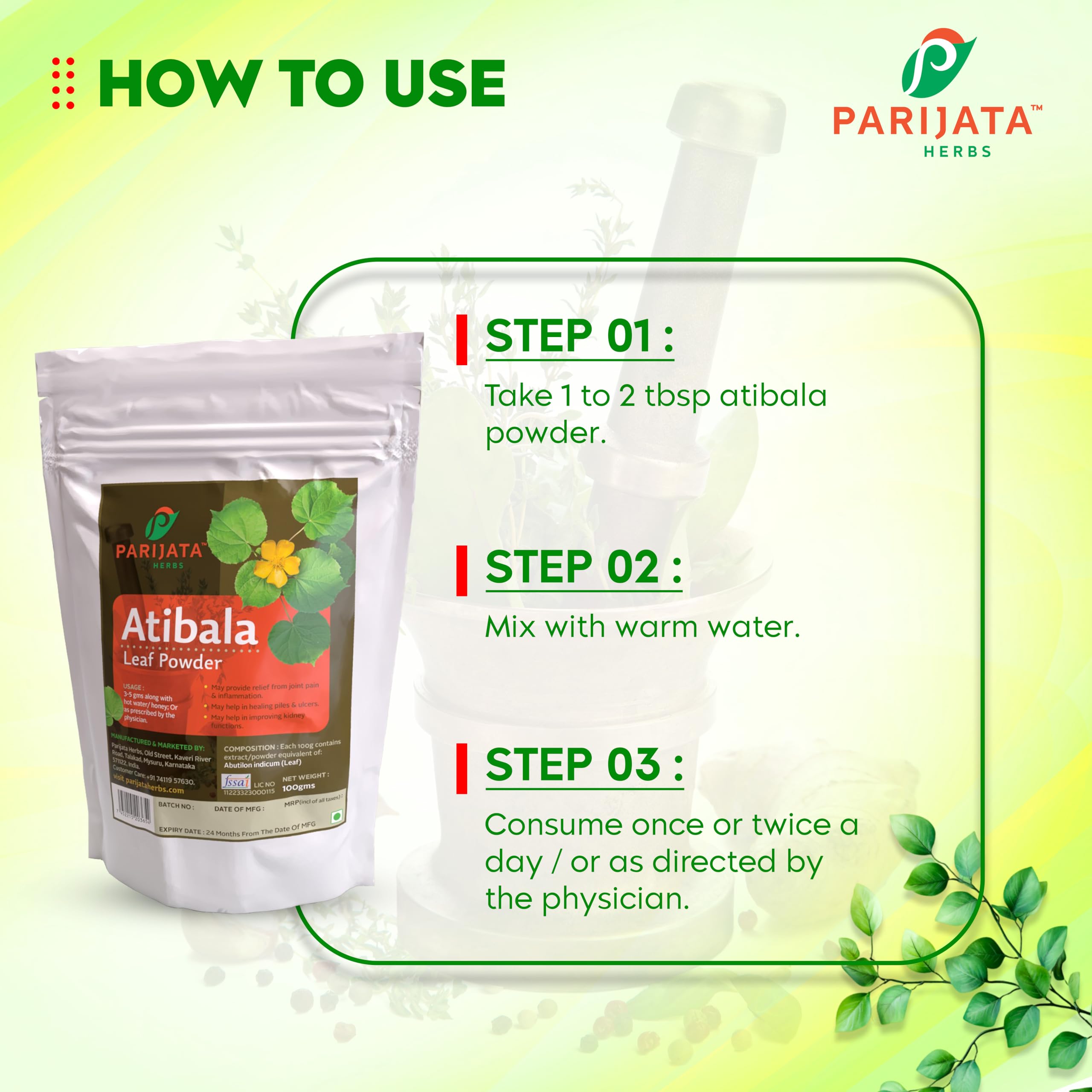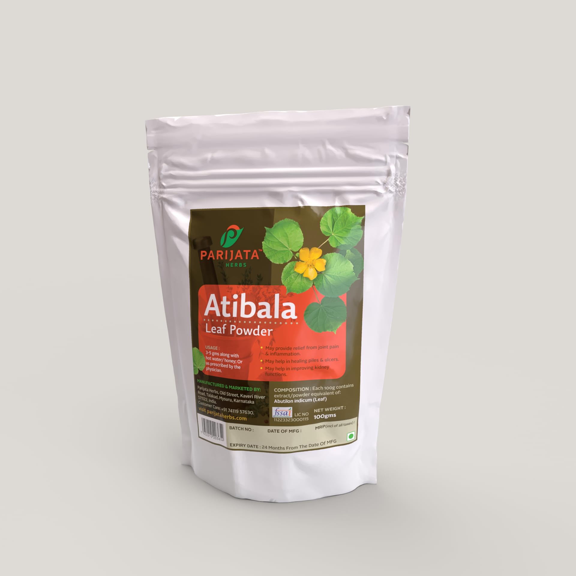 • Pure and Natural: Atibala leaf powder is made from pure and natural Ayurvedic herbs free from any synthetic additives or preservatives.