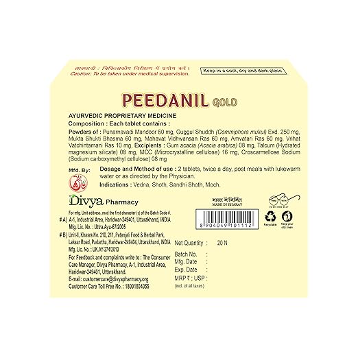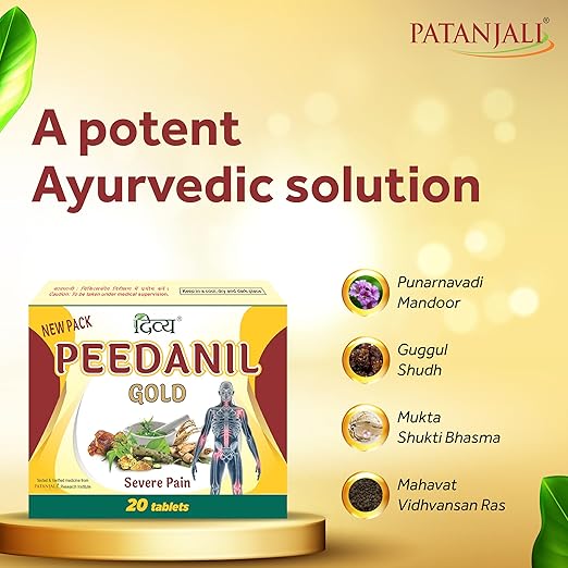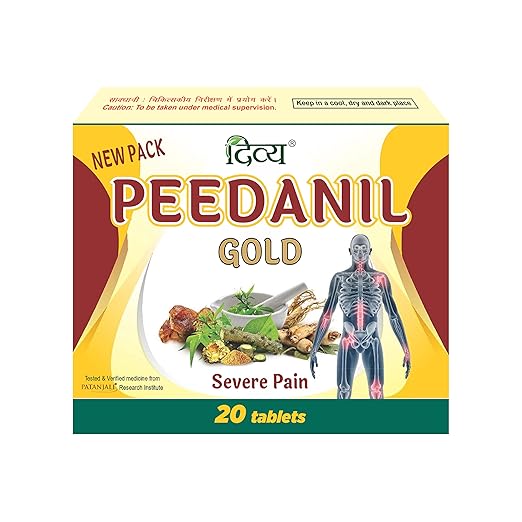 Patanjali Divya Peedanil Gold Tablet is known for its analgesic properties. Knee pain is primarily caused by cartilage damage, and this advanced treatment modality may help repair or restore damaged cartilage, thereby relieving joint pain. Patanjali Divya Peedanil Gold Tablet is known for its ability to treat pain, inflammation, and sprains, among other conditions. Its natural components are thought to have the ability to repair or restore damaged cartilage, thereby alleviating joint pain.
