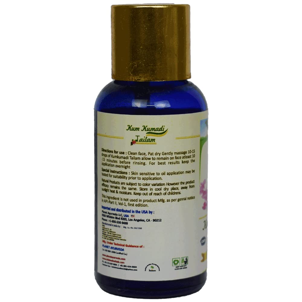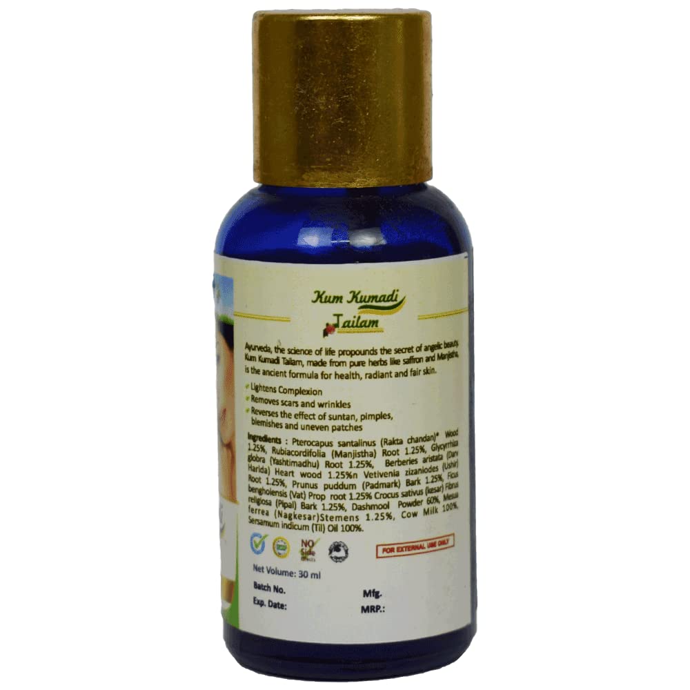 It is beneficial in Skin problems. It provides nourishment to the skin. Diminish scars and fine lines over the skin. Directions for Uses - Clean face pat dry and gently massage 10-15 drops of Kum Kumadi Tailam. Allow to remain on face for at least 10-15 minutes. For best results leave the application overnight and wash in the morning. Special Instructions - Skin Sensitivity to oil application may be tested for suitability prior to application.