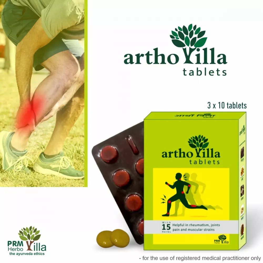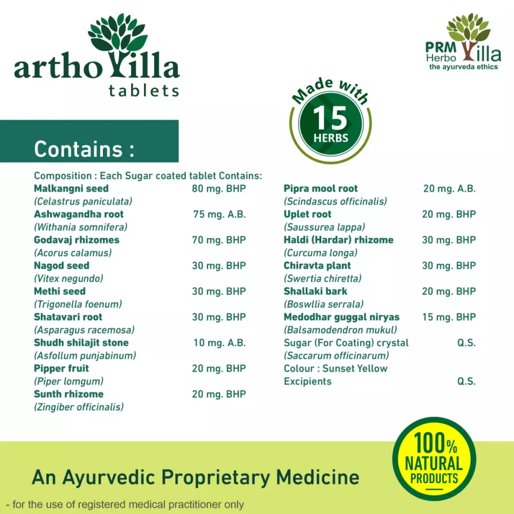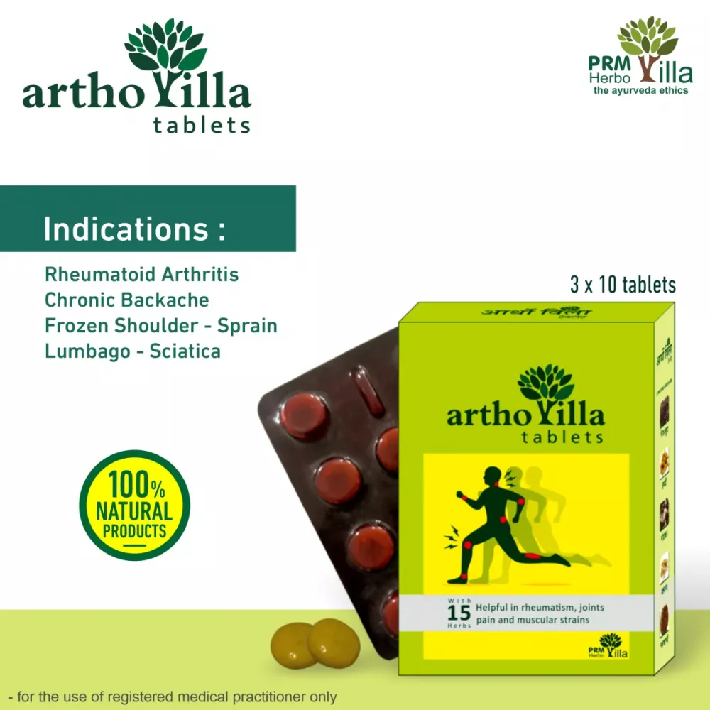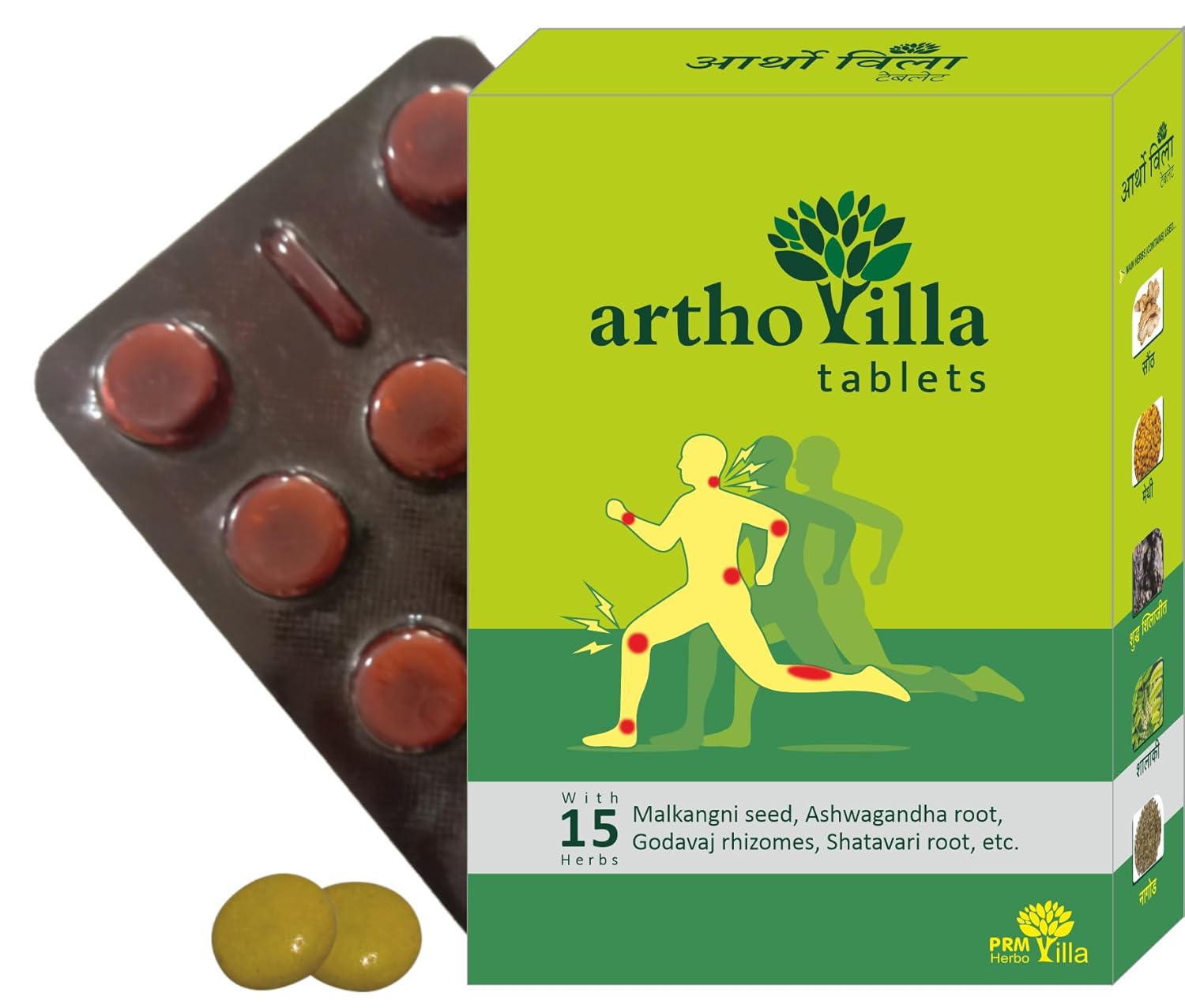 Arthovilla Tablets are the summation of selected 15 multi-combined ayurveda herbs like Methi, Haldi, Medohar Guggal, Shallaki, Malkagni, Shuddh Shilajit, Shatavari and many more. Arthovilla Tablet is an ayurvedic proprietary medicine to restore joints and arthritis problem through balancing tri-doshas. This formula helps to relief from joints pain, muscle pain, sciatica, rheumatoid arthritis, frozen shoulder - sprain.