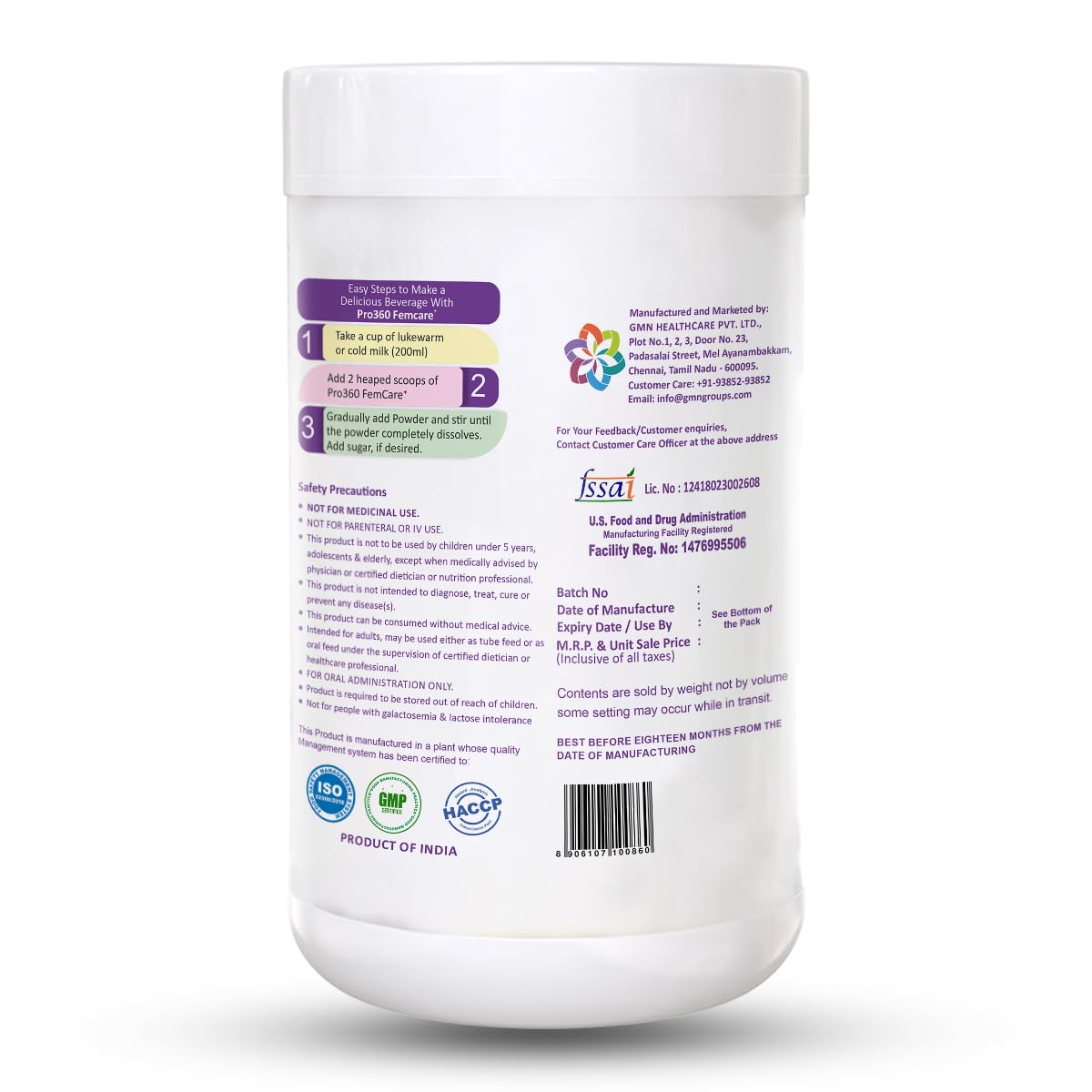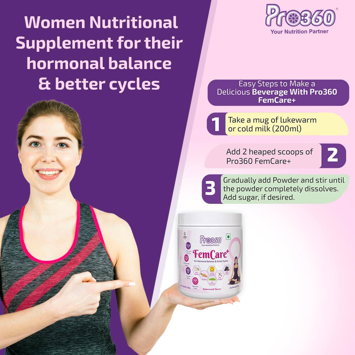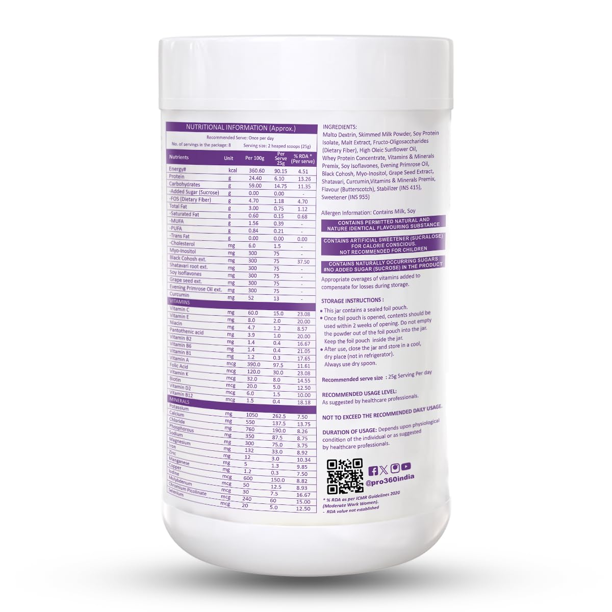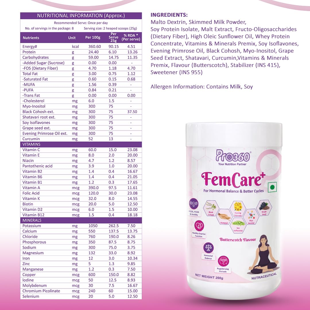 Pro360 FemCare+ PCOS PCOD Nutritional Supplement Powder for Hormonal Balance Better Cycles Supports Normal Ovulation in Women for Reproductive Wellness - Butterscotch Flavor 200gm