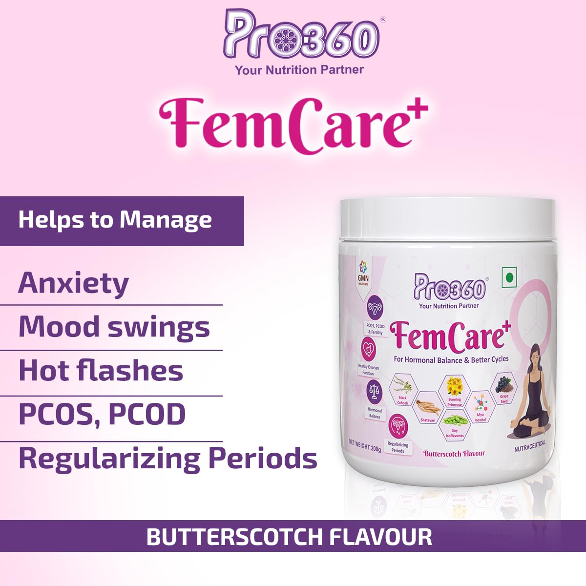 Pro360 FemCare+ PCOS PCOD Women Wellness Nutritional Supplement for their hormonal balance and better cycles which alleviate anxiety mood swings hot flashes.