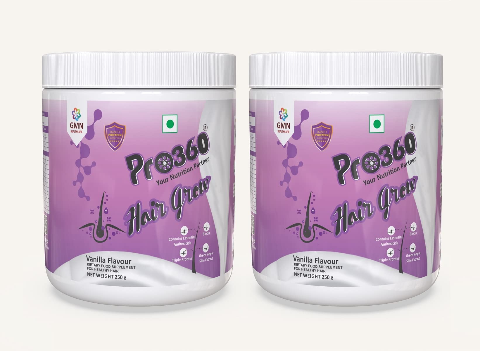 Pro360 Hair Grow Protein Powder for Healthy Hair Growth Nutrition Supplement for Men and Women - Enriched with Biotin and Green Apple Skin Extract - Vanilla Flavor (250+250) g Pack of 2