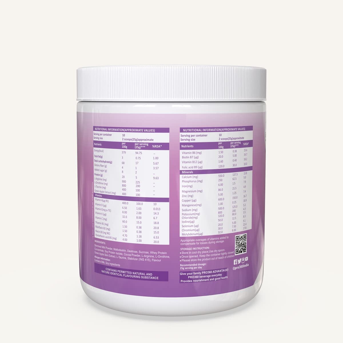 • Triple Protein Formula: Along with being rich in Fibre Vitamins and Minerals Pro360's Balanced Formula provides an amazing dose of High Protein as well. The Tri-Protein Formula consists of Skimmed Milk Powder Whey Protein and Soy Protein all of which comb