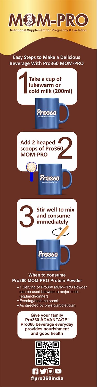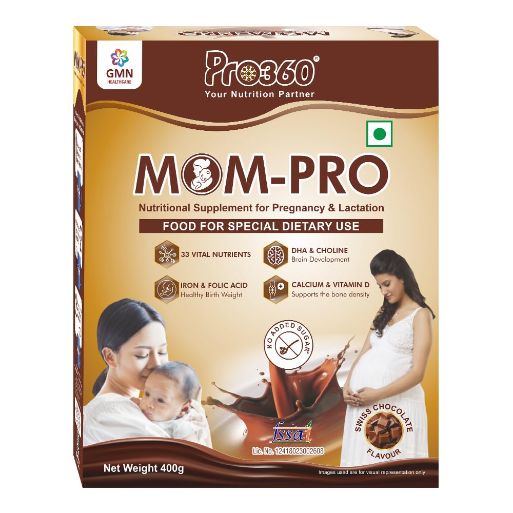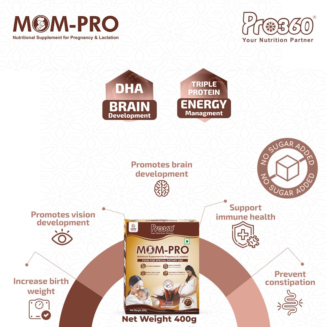 HomeHealth & PersonalDiet & NutritionHealth SupplementsPro360 MOM-Pro Protein Powder for Pregnant Women | 400gm Swiss Chocolate Flavour Nutritional Powder for Pregnancy | Mother Protein Powder | Vital Nutrients to Support Baby Brain Development