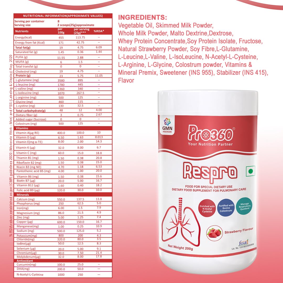 Pro360 Respro (fka Respiro) Nutritional Protein Supplement with N-Acetyl L-Cysteine (NAC) for Pulmonary Care - Strawberry Flavor - 200g