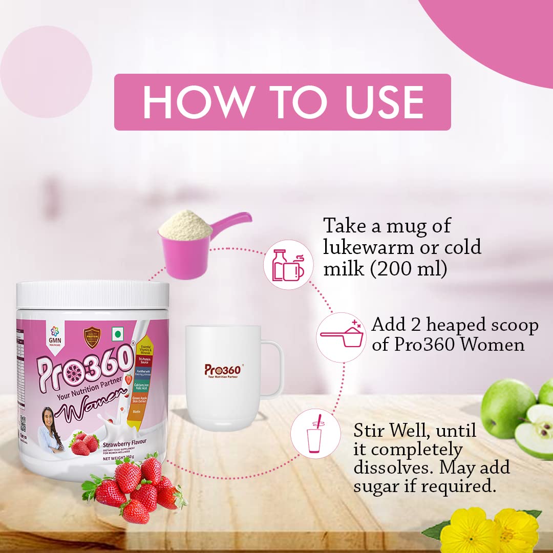 HomeHealth & PersonalDiet & NutritionHealth SupplementsPro360 Women Protein Rich Nutritional Supplement Enriched with Calcium Iron for Stronger Bones and Improved Haemoglobin 25 Essential Nutrients with Evening Primrose Butterscotch Flavor 500G