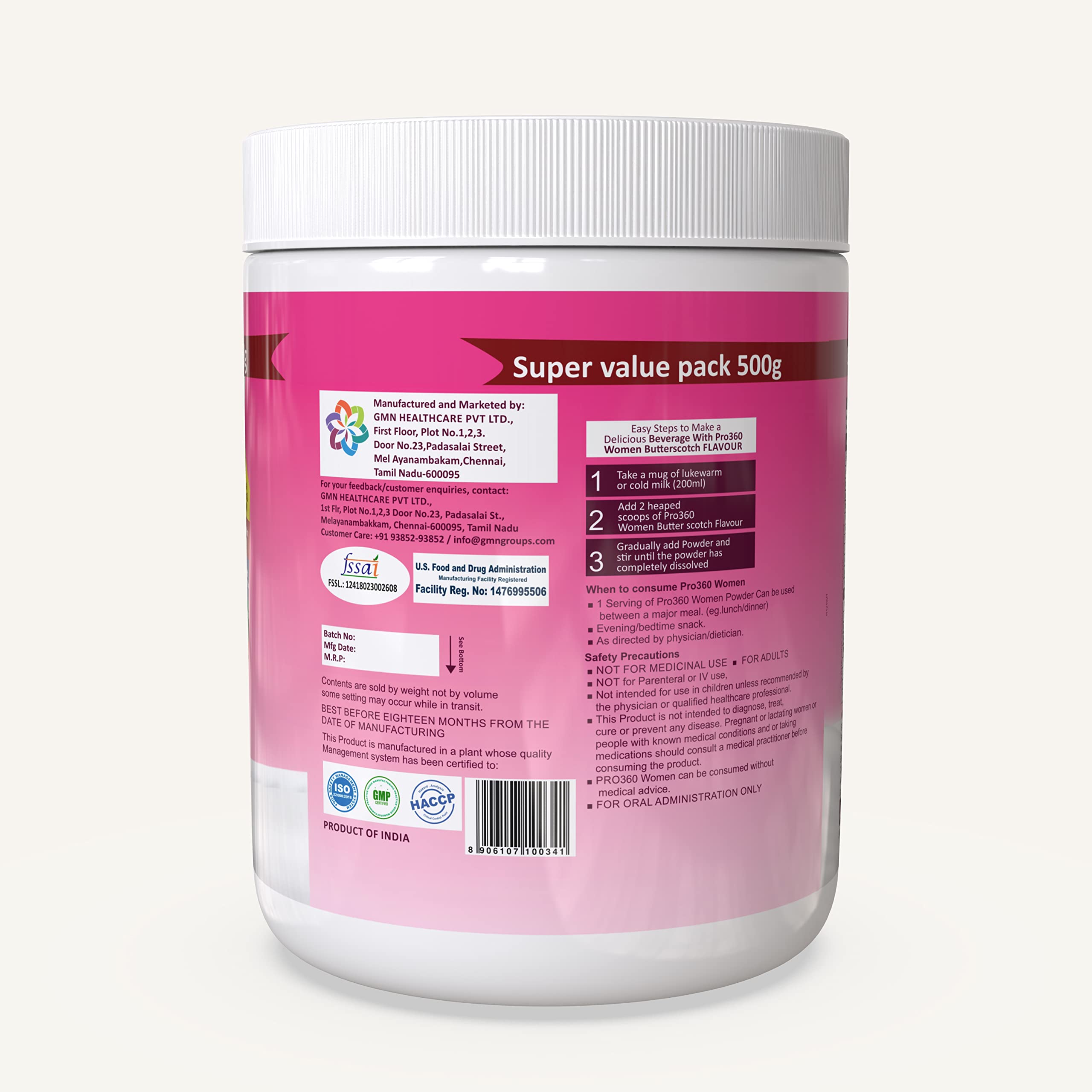 Pro360 Women Protein Rich Nutritional Supplement Enriched with Calcium Iron for Stronger Bones and Improved Haemoglobin 25 Essential Nutrients with Evening Primrose Butterscotch Flavor 500G