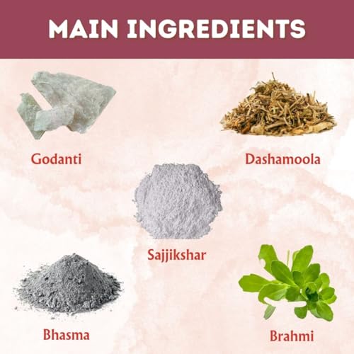 Each film coated tablet contains godanti bhasma 100mg sajjikshar powder 50mg pippalimool powder 25mg dashamool extract 100mg ashwagandha extract 50mg brahmi extract 50mg shankhpushpi extract 50mg khurasani ajwain powder 50mg yashtimadhu powder 50mg excipients: xanthan gum magnesium stearate silicon dioxide starch colour coat.