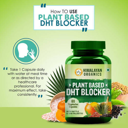 Himalayan Organics Plant Based DHT Blocker, With Nettle & Saw Palmetto: 60 Vegetarian CapsulesHimalayan Organics Plant Based DHT Blocker Vegetarian Capsule is made up of ingredients that support hair growth and blocks hair fall. It may help in providing scalp and hair with needed nourishment. Key Ingredients:PumpkinNettle ExtractSaw PalmettoDirections For Use:Use as directed by the physician. Safety Information:Store in a cool and dry place Keep out of the reach of childrenRead the label carefully Store in a cool and dry placeUse under medical supervisionLegal Disclaimer: Statements regarding dietary supplements have not been evaluated by the FDA and are not intended to diagnose, treat, cure, or prevent any disease or health conditionNote: The product is guaranteed to be 100% genuine. Product images are for illustrative purposes only. Images/packaging/ labels may vary from time to time due to th
