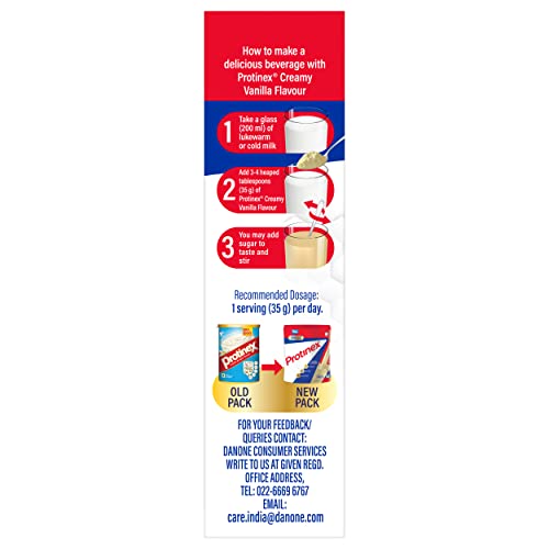 Protinex Creamy Vanilla is a vegetarian nutritional beverage mix that should be consumed daily as part of a healthy lifestyle for your everyday health. It is now clinically proven for strength and energy. It increases your strength and energy nutrients by 34%. With a rich legacy of over 65 years Protinex comes with high protein content (34g for every 100g) that helps you fight tiredness + fatigue and delights you with its rich creamy taste! Lack of protein leads to loss of muscle strength which in turn leads to frequent tiredness and fatigues in our daily lives. Protein makes up about 50% of muscles & bones in our body and our body cannot store protein â hence it needs to be consumed daily! Protinex helps in bridging this gap of protein and other essential nutrients in regular Indian Adult diets. Protinex should be consumed daily as part of a healthy lifestyle for everyday health. Protinex Creamy Vanilla is also enriched with calcium vitamin D and immuno-nutrients for your everyday health helping with stronger muscles & bones long-term immunity and stamina to power through each day.