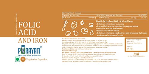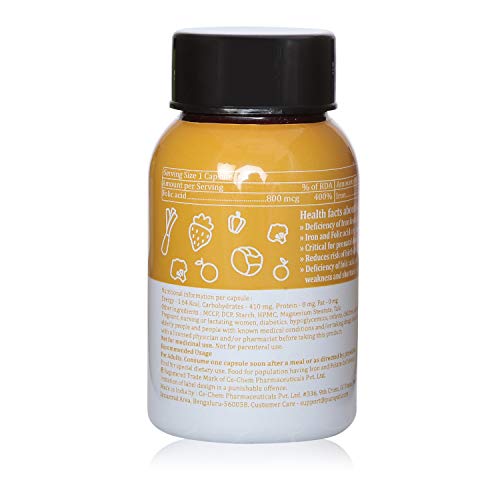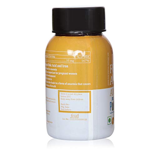 Iron is an essential component of many proteins and enzymes in our body. But its most important and well known role is in transportation of oxygen from the lungs to the rest of the body. Therefore deficiency of Iron leads to the most common form of anaemia. Pregnant women need it more due to their higher demand of oxygen. People following a vegetarian diet also tend to require more Iron per day as Iron from plants is absorbed less efficiently than from animal sources. Folic acid is a form of Vitamin B that is water soluble. This means that it very easily gets removed from the body on a daily basis. Therefore it is very important to ensure that we regularly consume the daily required quantity of folic acid to make up for the loss. Folic acid is essential in a variety of reactions critical to the metabolism of nucleic acids and amino acids. It is essential in the synthesis of DNA. Due to its role in the synthesis of DNA and nucleic acids folic acid is essential in situations where there is increased rate of cell division. This is why consuming folic acid can play a role in prenatal development and can also reduce the risk of birth defects. In adults folate deficiency at the rapidly dividing cells of the bone marrow can lead to blood cell division becoming abnormal which means fewer but larger red blood cells are generated. This is a form of anemia that causes fatigue weakness and shortness of breath. It is important to note that this product should not be taken with any form of calcium supplement or multivitamin containing calcium as Iron affects the absorption of calcium from supplements. It is advisable to take them at separate times of the day. This product has been manufactured at a well equipped FSSAI and ISO 9001 2008 certified manufacturing plant which ensures you get a high quality and efficacious product that you can use to tackle your deficiency of Iron and Folic acid.