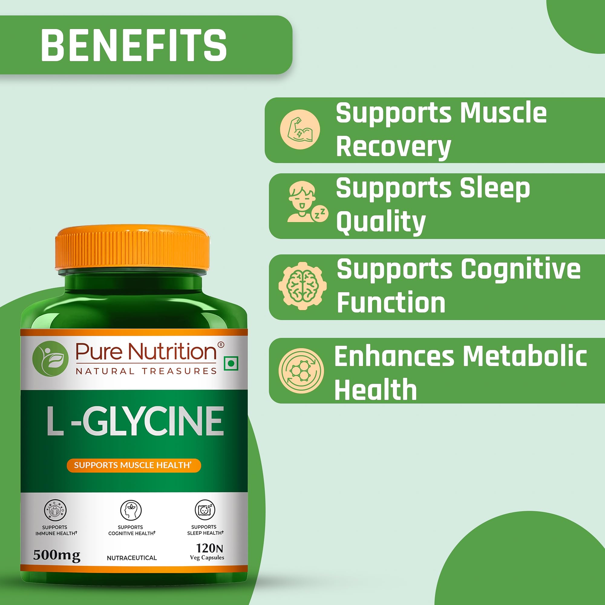 Pure Nutrition L-Glycine 500mg is a premium amino acid supplement designed to support muscle recovery brain function and restful sleep. Each vegetarian capsule delivers 500mg of pure L-Glycine helping regulate neurotransmitters and promote overall nervous system health. It also helps in immune function and cellular repair making it ideal for active individuals and wellness enthusiasts
