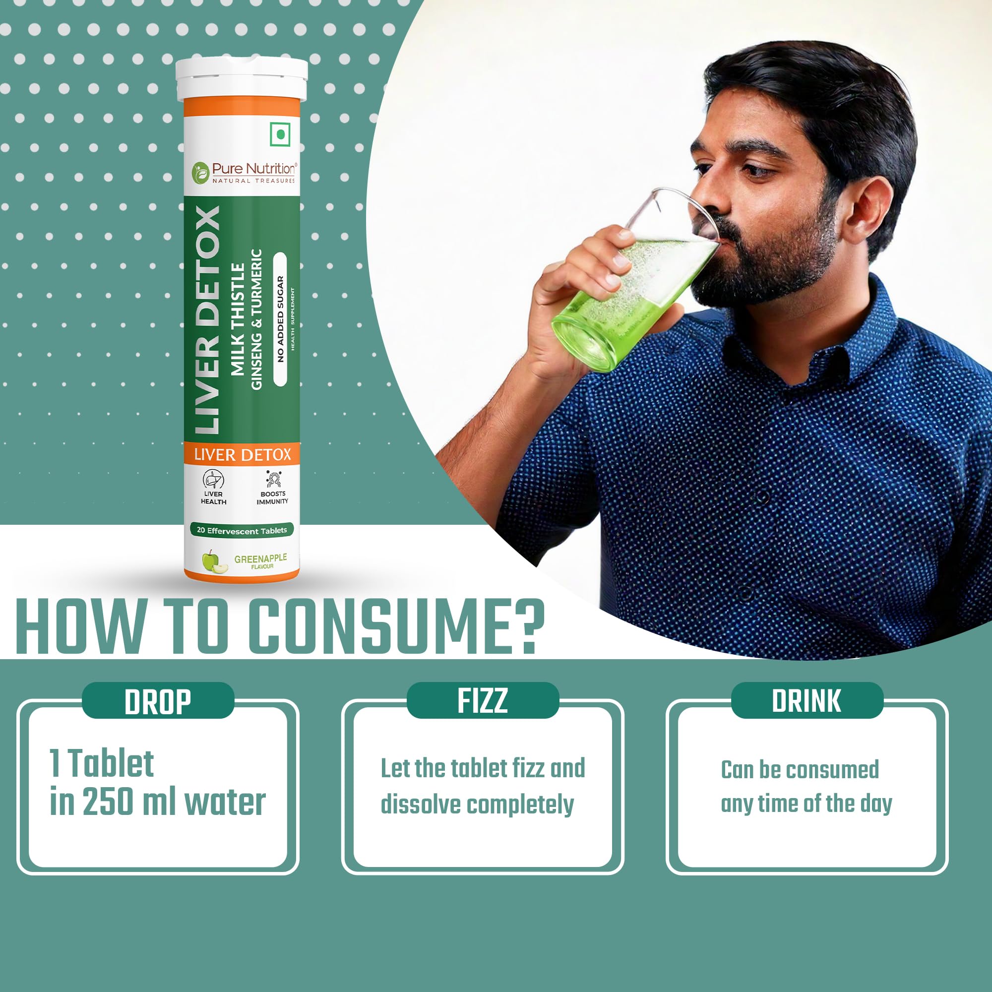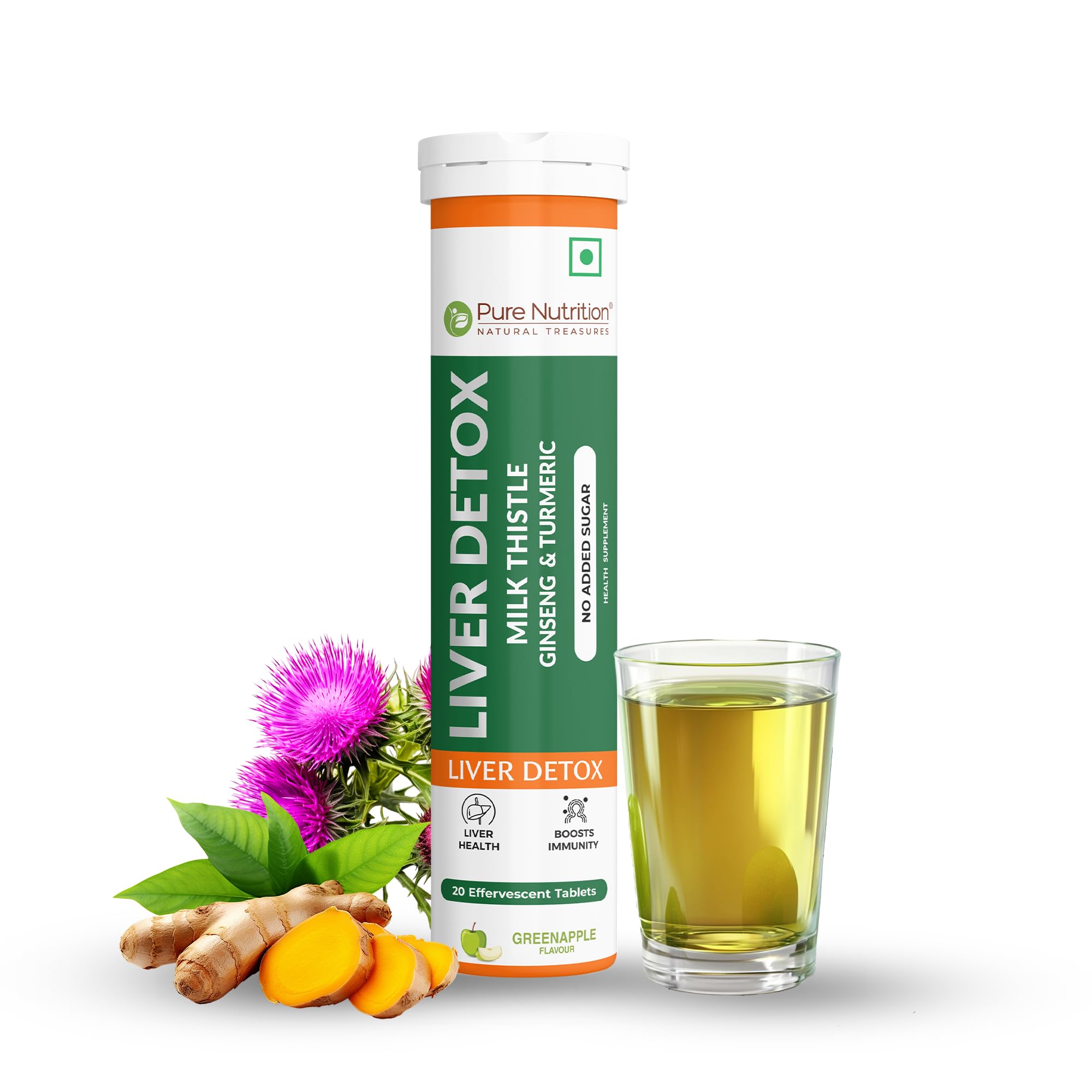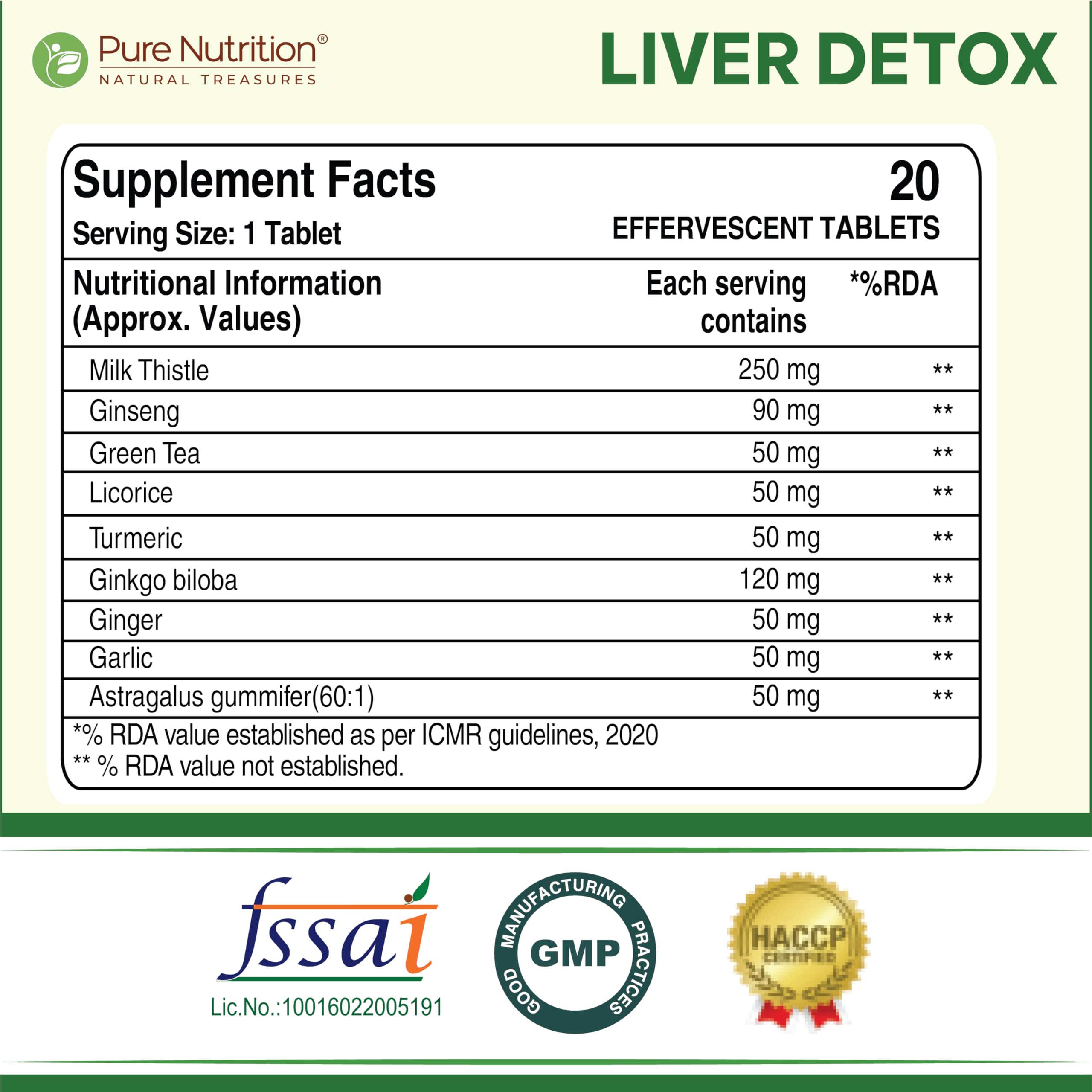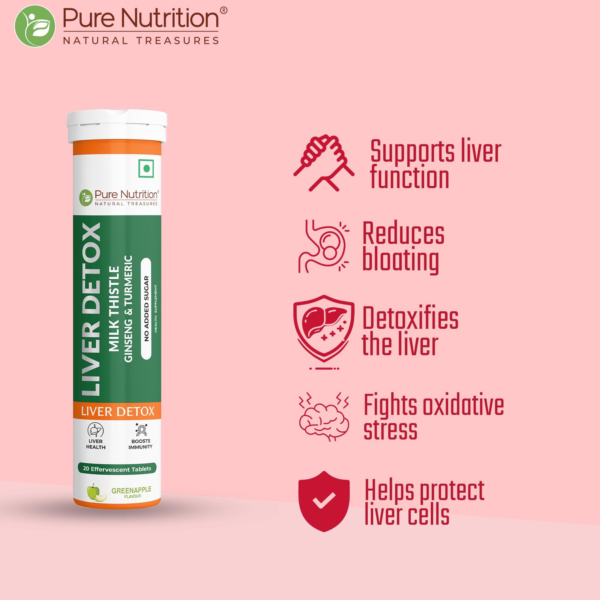 Pure Nutrition LIVER Detox 20 Effervescent Tablets with Ginseng & Turmeric is a specialized dietary supplement designed to promote liver health and detoxification combining the benefits of well-known ingredients like Ginseng and Turmeric along with other detox-supporting nutrients. This effervescent formula makes it easy to incorporate into your routine offering an alternative to traditional pills or capsules.