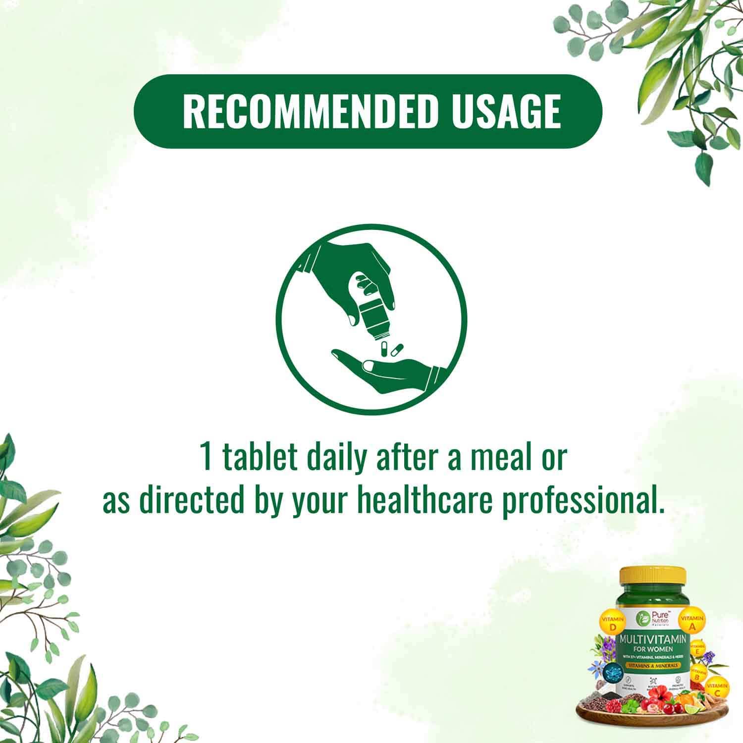 Pure Nutrition Multivitamin for Women (1500mg) 60 Veg Tabs with Biotin Iron Alfa Alfa Moringa Ginseng Fenugreek & Green Tea | Supports Immunity Energy Stamina Bone & Overall Health
