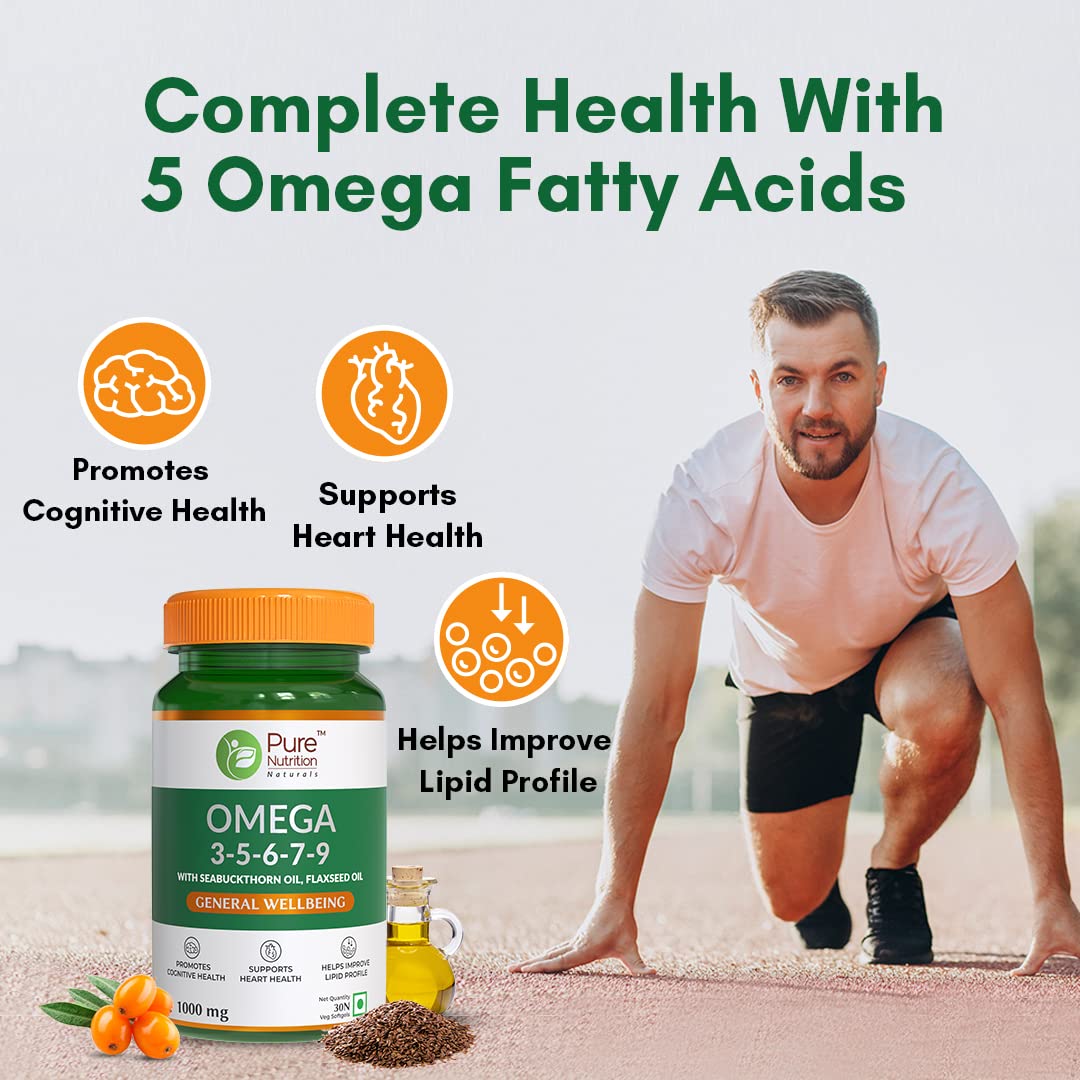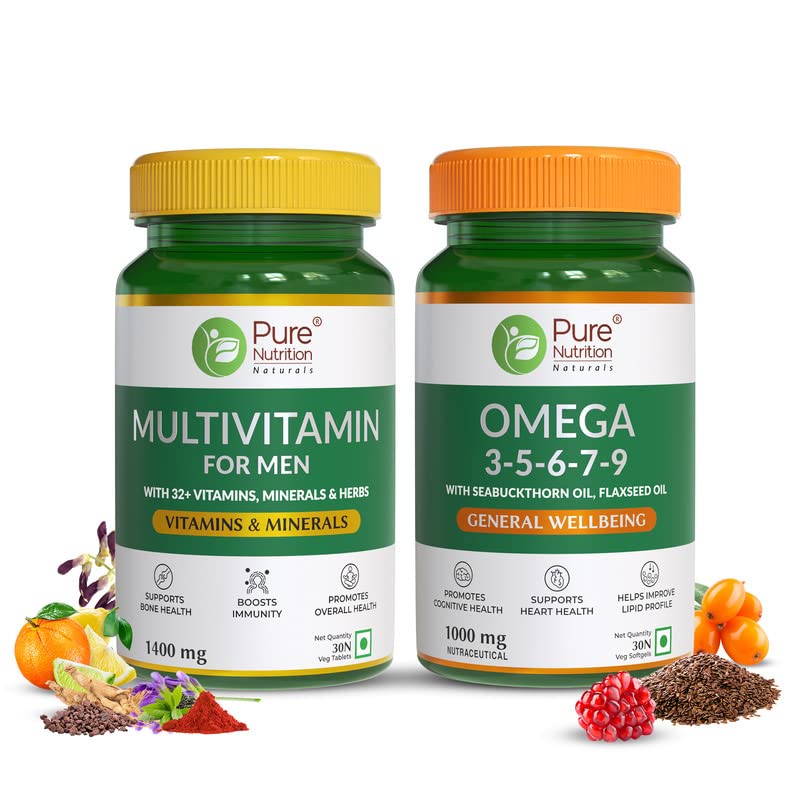 Pure Nutrition's Multivitamin for Men is a Men Multivitamin supplement rich in antiand contains omega-3 fatty acids and herbal extracts that promote better health. It comprises all the essential vitamins mineralong with an amino acid blend to fulfill the daily nutrient requirements of men. It helps improve athletic performance and increase strength as it contains amino acids and herbs that enhance nutrient dey to muscles. These Multivitamin Tabs. promote muscle growth build endurance & strengthen bones. Pure Nutrition Omega 3-5-6-7-9 is a multi-purpose supplement that brings the goodness of the five omein one product. The omega supplement is formulated using flaxseed oil pomegranate seed oil borage oil sea buckthorn oil and olive oil. These omega 3 5 6 7 9 Caps. are beneficial for and . They help fight and support . The omega vegetarian Caps. are made of all-Naturals al and plant-based sources of omega ensuring safe consumption.