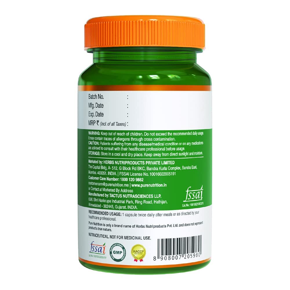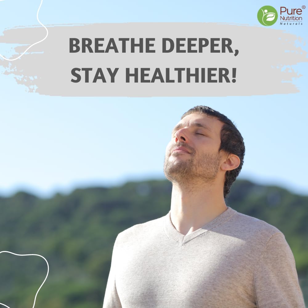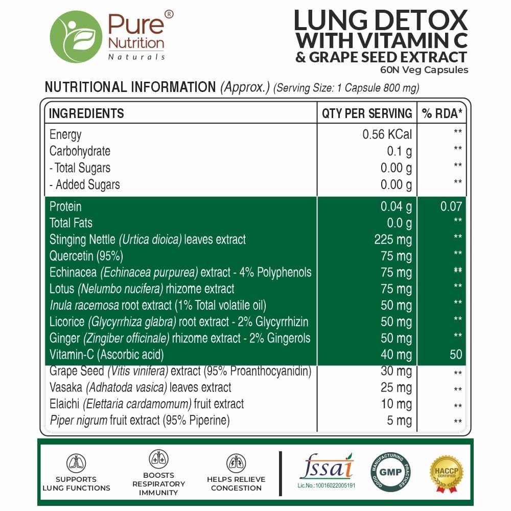 Pure Nutrition Naturals Lung supplement is a powerful blend of herbs and vitamins that help strengthen your health. It supports the healthy functioning of the by removing waste caused by smoking pollution and environmental toxins. itionally these lung cleaner Caps. protect your lungs and help prevent allergies. Pure Nutrition Lung Caps. contain extracts of Naturals al ingredients like stinging nettle Echinacea Vasaka leaf ginger grape seed cardamom fruit and more which are high in virucidal and antioxidant agents that help in viral infections. The ingredients o help relieve the symptoms of phlegm deposits congestion and improve breathing. It is a 100% vegetarian product with no active artificial ingredients and other non-affective components.