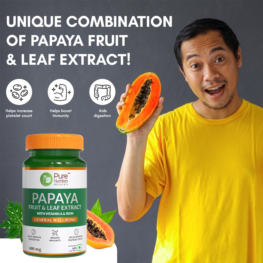 Pure Nutrition Papaya is a potent health supplement made from extracts of papaya fruit and its leaves. It's a great source of paand chymopathat help in breaking down proteins that speed up the process Naturals ally. Papaya leaf extract is one of the richest sources of antiand serves as a platelet er. Papaya leaves are loaded with various constituents like tannins saponins and alkaloids. These alkaloids act as a protective agent on the bone marrow and help prevent platelet destruction in the . Papaya is known for its rejuvenating and ifying properties. Proteolytic enzymes such as pachymopacaricain & glycyl endopeptidase help relieve disorders and are extremely useful in soothing any kind of disturbances of the trointestinal tract. This in turn eases stomach ailments and . Pure Nutrition Papaya with papaya fruit and papaya leaf extract thus helps ease and serves as an er.