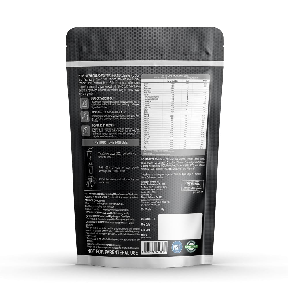 Pure Nutrition Naturals Sports Mass Gainer| Macronutrient blend with vitamins minerCreatine Monohydrate enzymes and MCTs| CHOCOLATE 1 KG POUCH