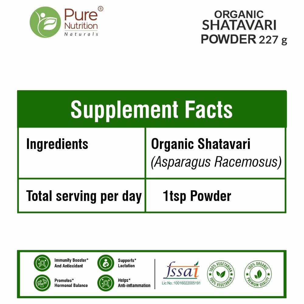 Pure Nutrition Organic Shatavari Root Powder (Asparagus Racemosus) 227g | Boosts Immunity Digestion | Ayurvedic & Herbal Supplement | Helps Balance Women's Hormones & Reproductive Health