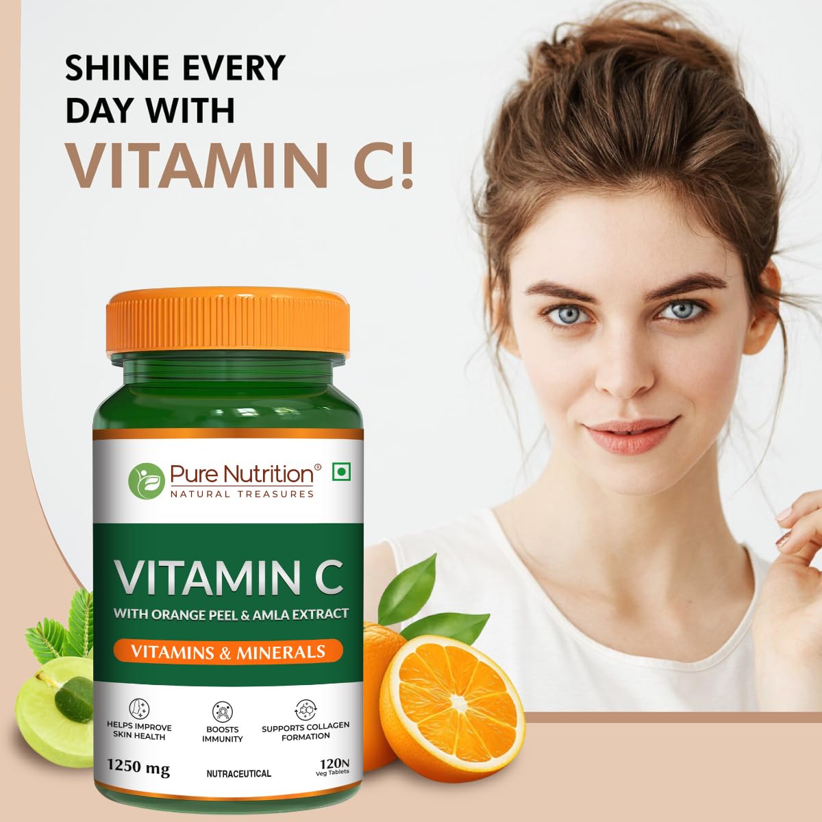 Pure Nutrition Vitamin C tablets are enriched with natural amla and orange peel extracts. Vitamin C is a potent antioxidant that helps prevent cellular damage and improves skin nail and bone health. Vitamin C tablets for immunity are a norm now. Since Vitamin C also helps reduce melanin and evens out skin tone one can rely on Vitamin C tablets for glowing skin. Meanwhile it is also essential for the formation of collagen. Collagen is found in the bones and skin and forms a protective layer in some of our vital internal organs. However our body cannot produce vitamin C on its own so we rely on external sources like Vitamin C supplements and a Vitamin C- rich diet to make sure our body receives the required nutrient in appropriate quantities. Loaded with the goodness of natural amla and orange peel extracts these immunity tablets are a perfect solution to promote overall health and beauty.