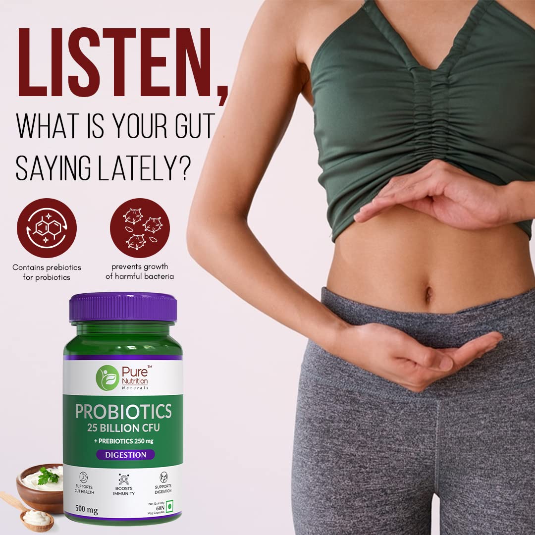 Pure Nutrition Probiotic + Prebiotic 60 Veg Capsules | 25 Billion CFU & 250mg Prebiotics for Men & Women | Improves Gut Health Aids Digestion Boosts Immunity & Eases Bloating 74 grams