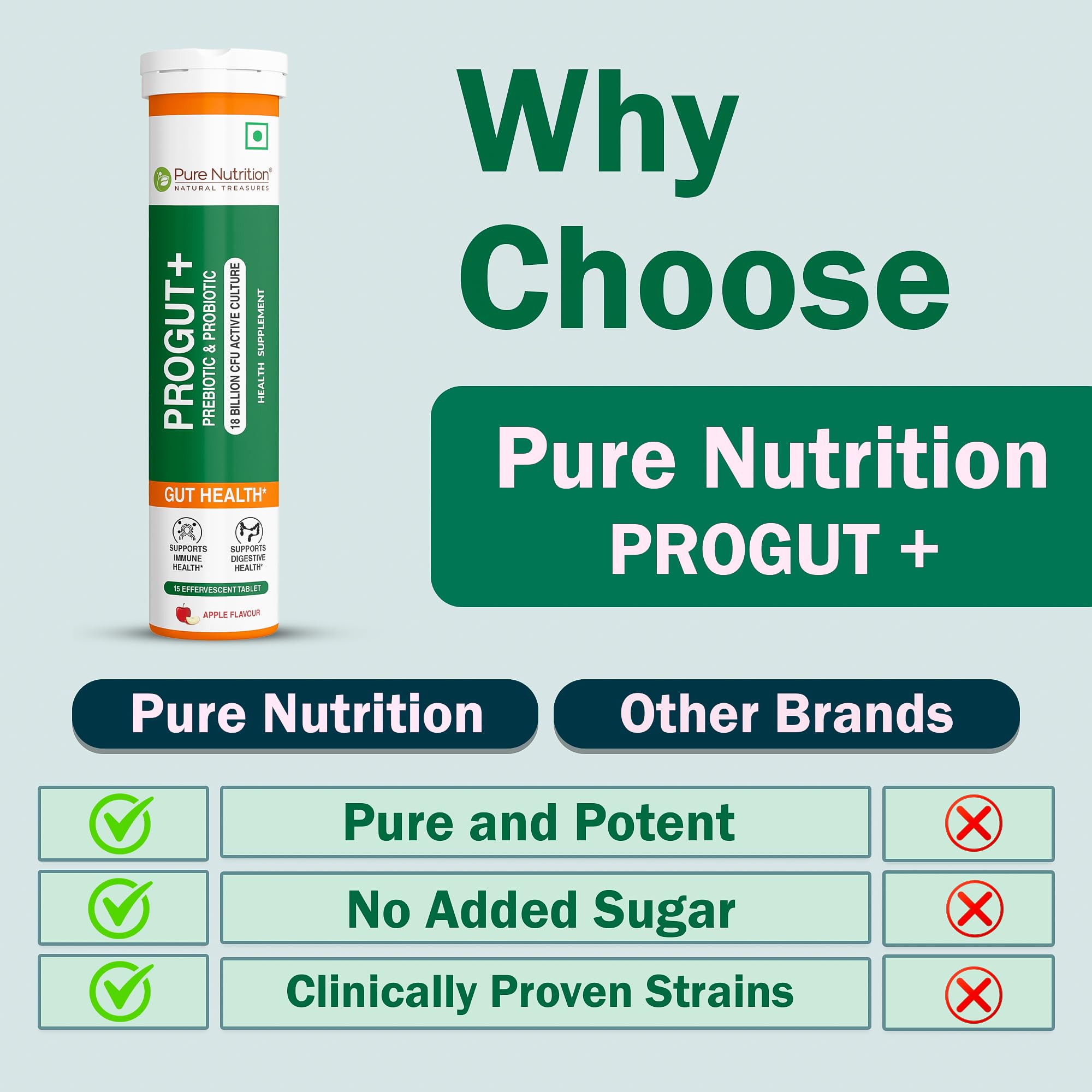 Support your digestive health and overall wellness with Pure Nutrition Progut+ a powerful blend of 18 billion CFU probiotics and prebiotics in a convenient effervescent tablet form. Each tablet is scientifically formulated to help relieve common digestive issues like indigestion constipation gas and bloating while also promoting immune health and nutrient absorption. Infused with a refreshing apple flavor Progut+ is easy to consumeâsimply dissolve one tablet in water and enjoy daily for optimal gut balance.