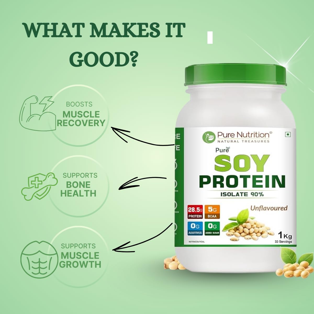 Pure Nutrition Soy Protein Isolate Powder - 1kg | 90% Isolate (27g Isolate per 30g Serving) Unflavoured | Supports Muscle Growth Recovery & Weight Management | Ideal for Fitness Overall Health & Vegan Diets | Low Carb & Gluten-Free Formula