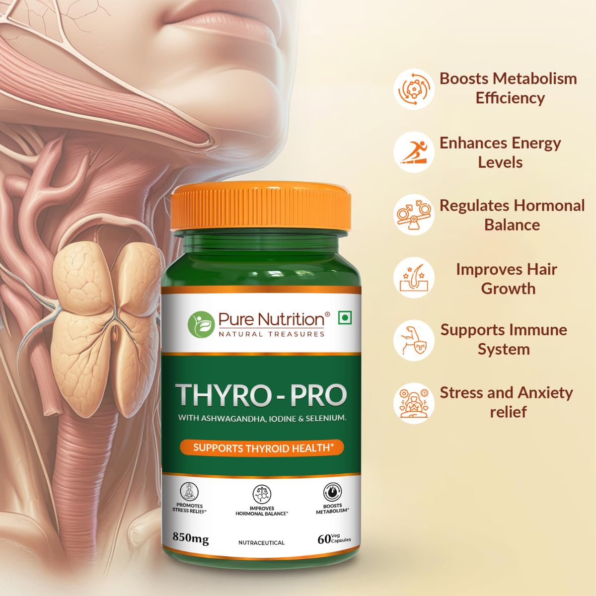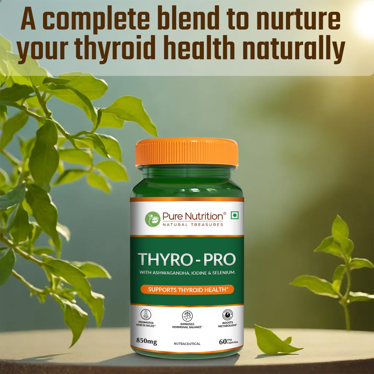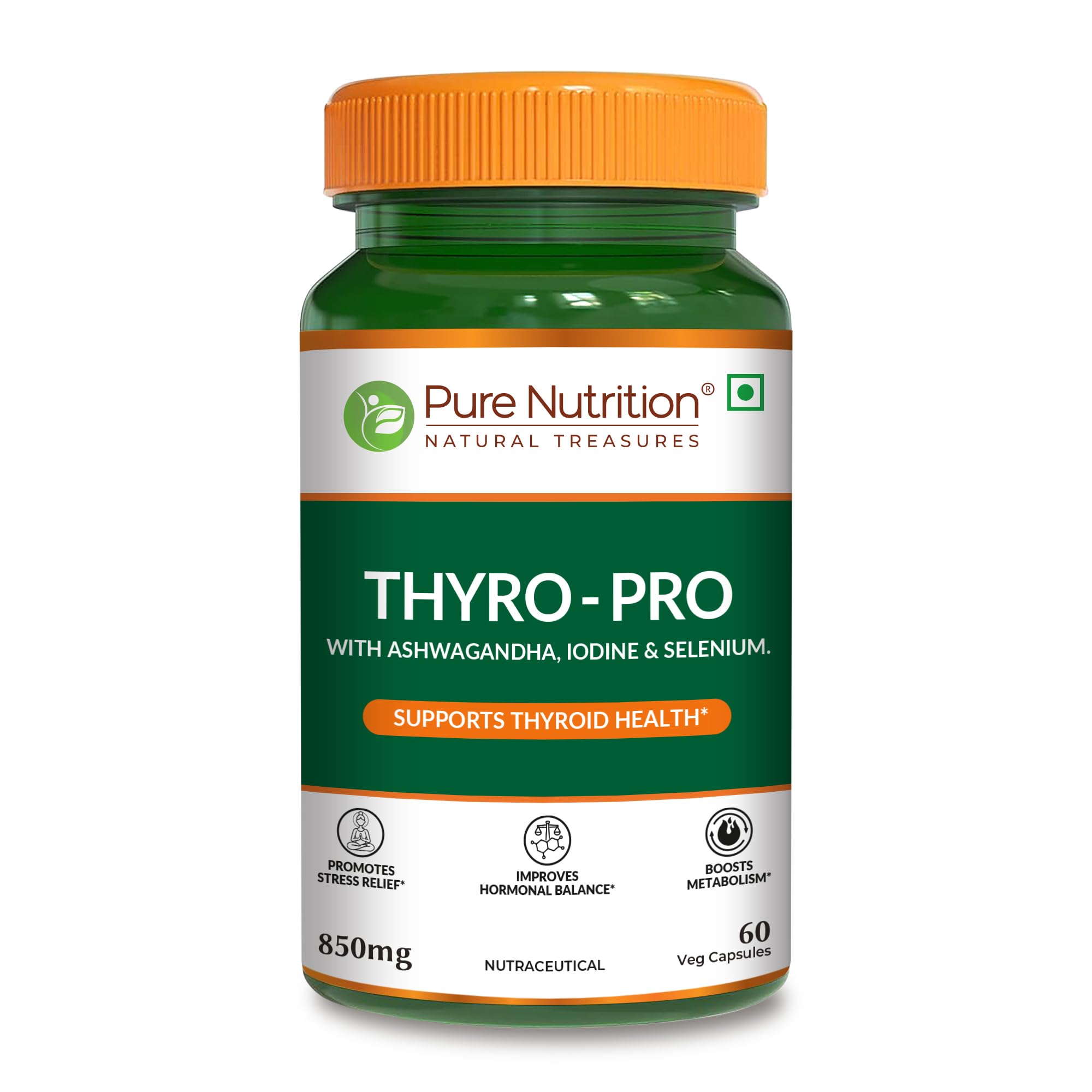 Pure Nutrition Thyro Pro is a powerful thyroid support supplement formulated with a blend of key ingredients like Ashwagandha Iodine and Selenium. These ingredients work together to promote hormonal balance support healthy thyroid function. The addition of Ashwagandha helps reduce stress and promotes overall well-being. This 120-vegetable capsule bottle is designed to support energy levels and stress relief making it a great choice for anyone looking to maintain a healthy thyroid and balanced hormone