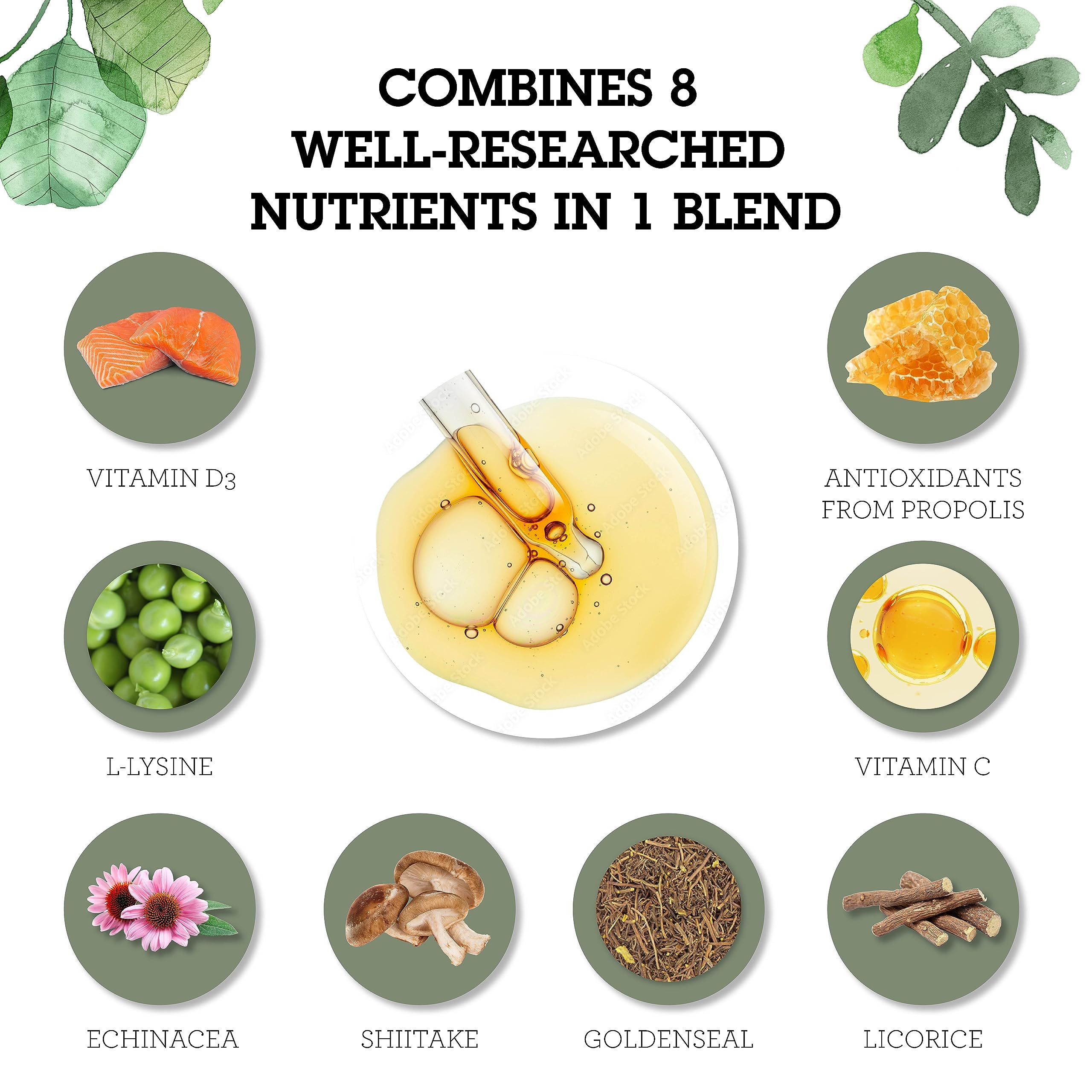 HERBAL IMMUNITY BOOSTER - Combines 8 nutrients in one with L-Lysine vitamin C & D3 shiitake mushroom goldenseal and Echinacea for immune support and healthy lips plus powerful antioxidants from propolis and licorice root.