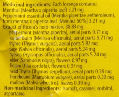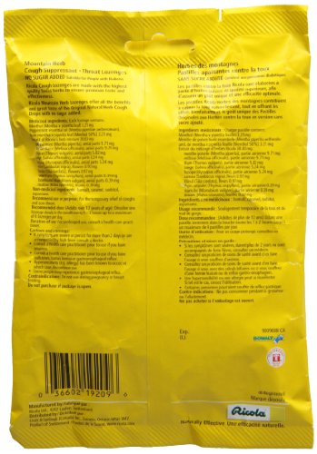 Ricola Mountain herb sugar free 19 drops is the sugar free version of our famous original cough suppressant. 4.8 mg of Menthol in every drop is malt is used as the sweetener.