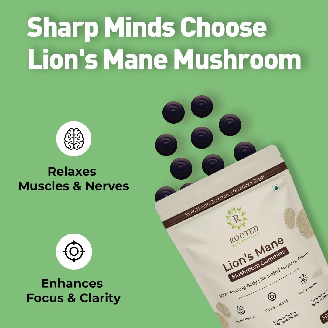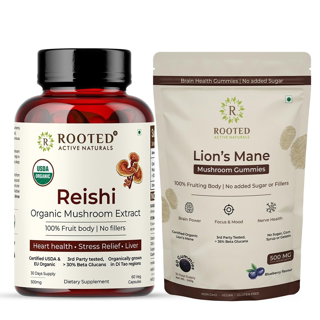 Unlock the power of brain health stress relief and overall well-being with Rooted Active Naturals Lion Mane Mushroom Gummies + Reishi Mushroom Capsules. This dynamic duo is designed to promote cognitive function relaxation and immune support helping you stay focused and balanced. Lion Mane Gummies support brain health focus and nerve function in a delicious sugar-free formula. Reishi Mushroom Capsules help with stress management heart health and liver support promoting overall wellness. Both are vegan gluten-free non-GMO and made with 100% fruiting body extract ensuring maximum potency and effectiveness.