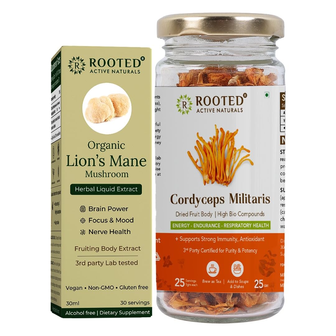 This premium mushroom duo features Lion Mane Mushroom Tincture and Cordyceps Militaris Dried Strands offering a natural and versatile addition to your wellness routine. Lion Mane Mushroom Tincture (30ml) Alcohol-free herbal liquid extract made from 100% fruiting bodies. Cordyceps Militaris Dried Strands (25g) Carefully dried fruiting body strands ideal for tea or culinary use.