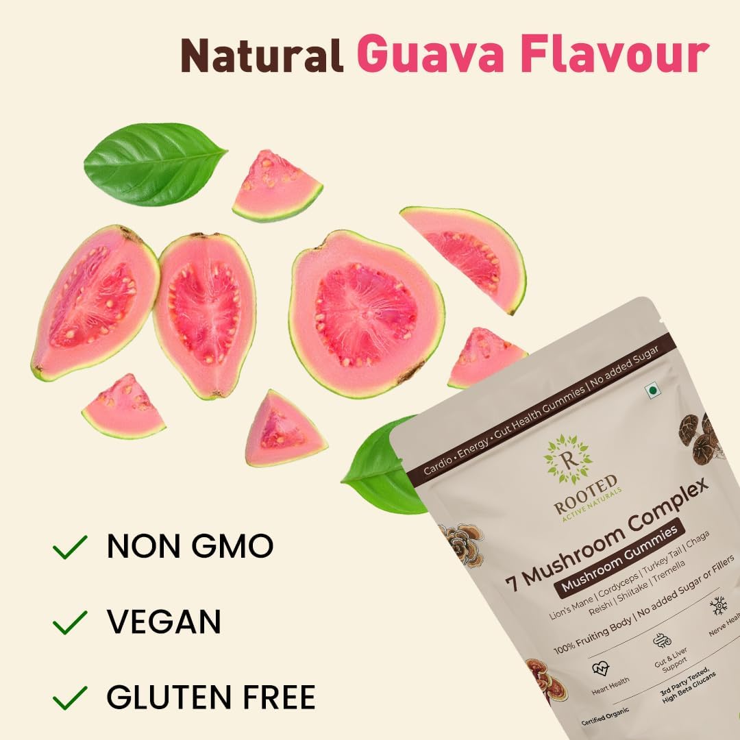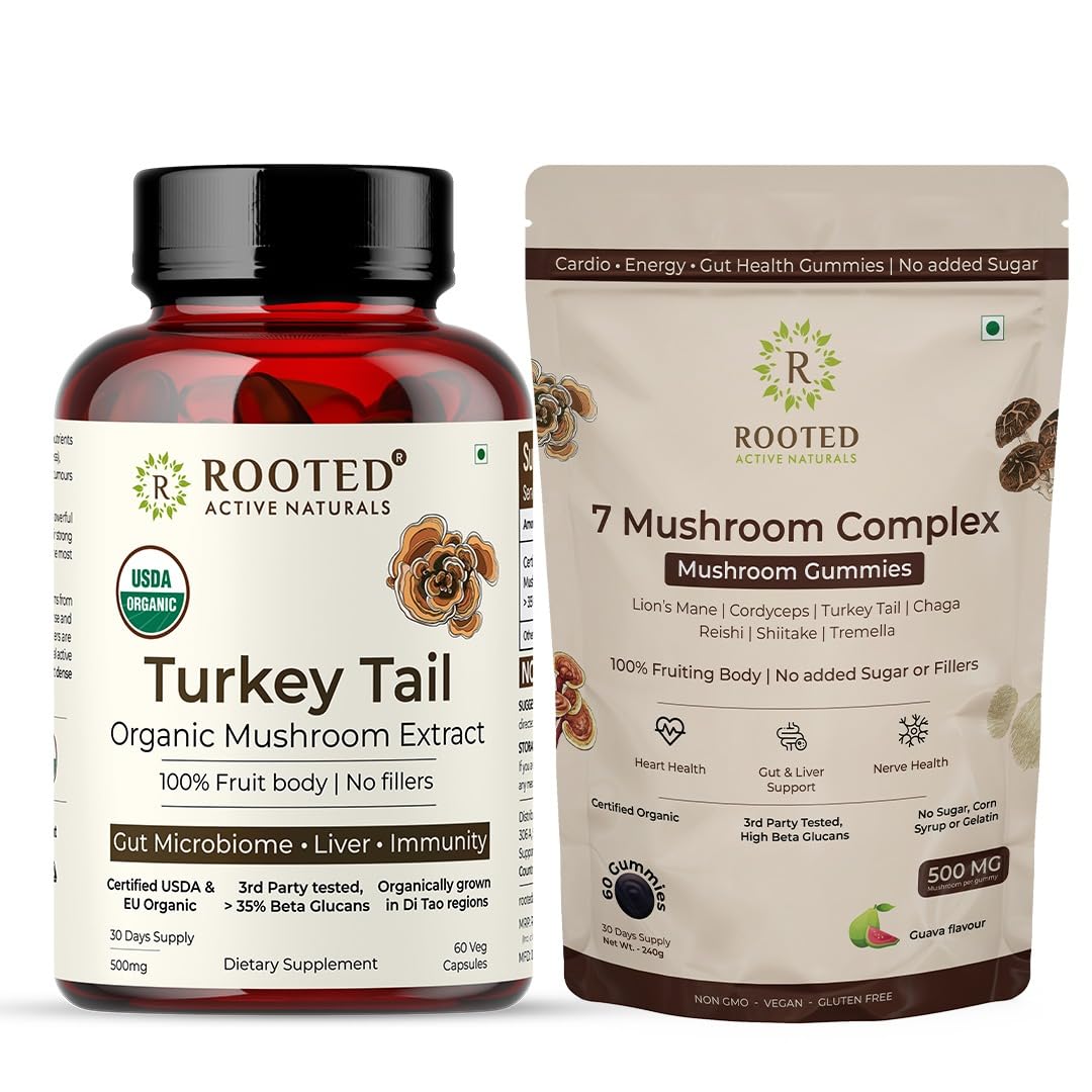 Support your gut liver and immune system with Rooted Active Naturals Turkey Tail Capsules and 7 Complex Gummiesa powerful combination of organic mushroom extracts designed for daily wellness. Turkey Tail Capsules (60 Caps) Made from 100% fruiting body extract rich in beta-glucans to promote gut health liver function and immune balance. 7 Complex Gummies (60 Gummies) A sugar-free guava-flavored gummy featuring Lion Mane Cordyceps Turkey Tail Reishi Chaga Shiitake and Tremella for full-spectrum support.