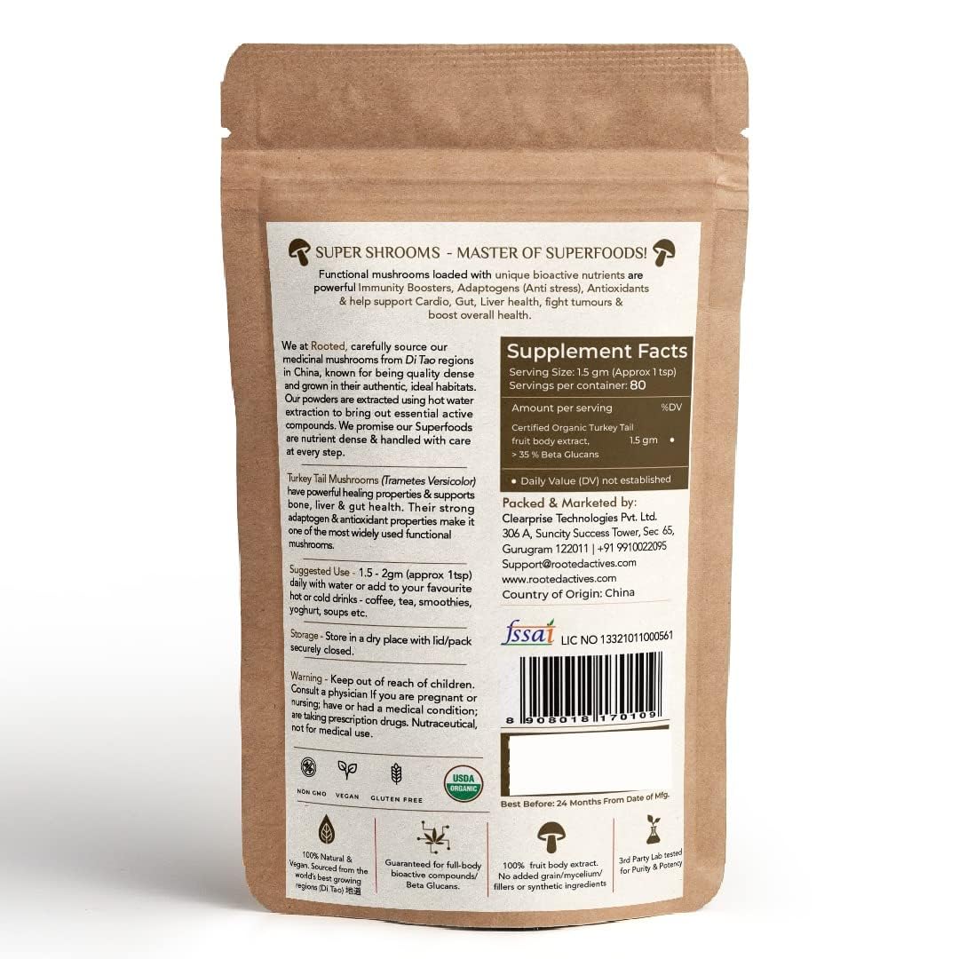 Boost your immune system and overall vitality with Rooted Active Naturals' Turkey Tail & Chaga Mushroom Powder. This powerful duo combines two of nature most potent functional mushrooms to provide gut health support antioxidant protection and immune-boosting benefits. Turkey Tail Mushroom Powder A rich source of prebiotics & beta-glucans Turkey Tail supports gut microbiome health digestion and immune function. Chaga Mushroom Powder Known as the âKing of Medicinal Mushroomsâ Chaga is packed with antioxidants polyphenols and adaptogenic compounds to promote cellular health and overall wellness. Both powders are 100% pure organically sourced and free from fillers additives or artificial ingredients.