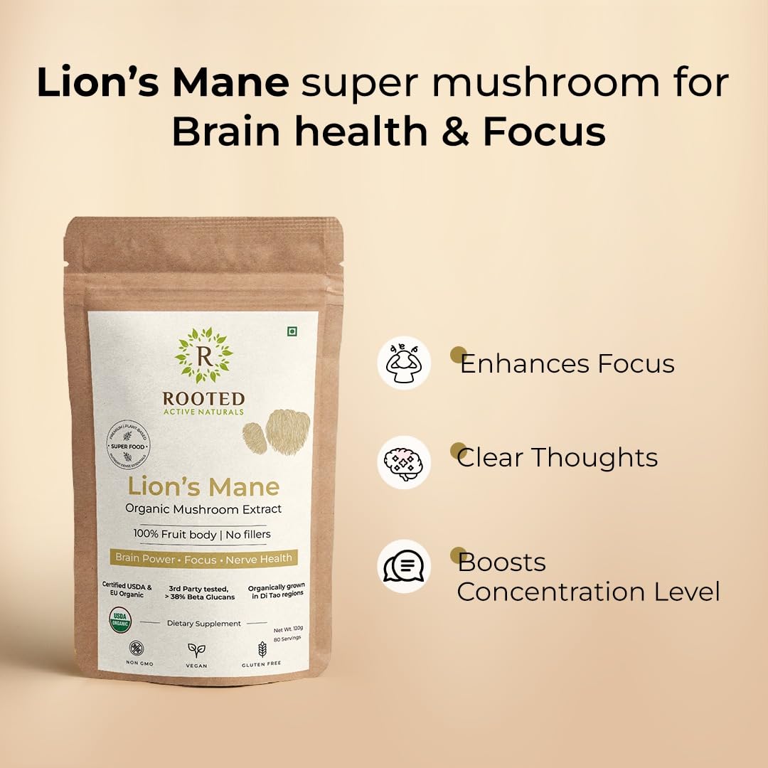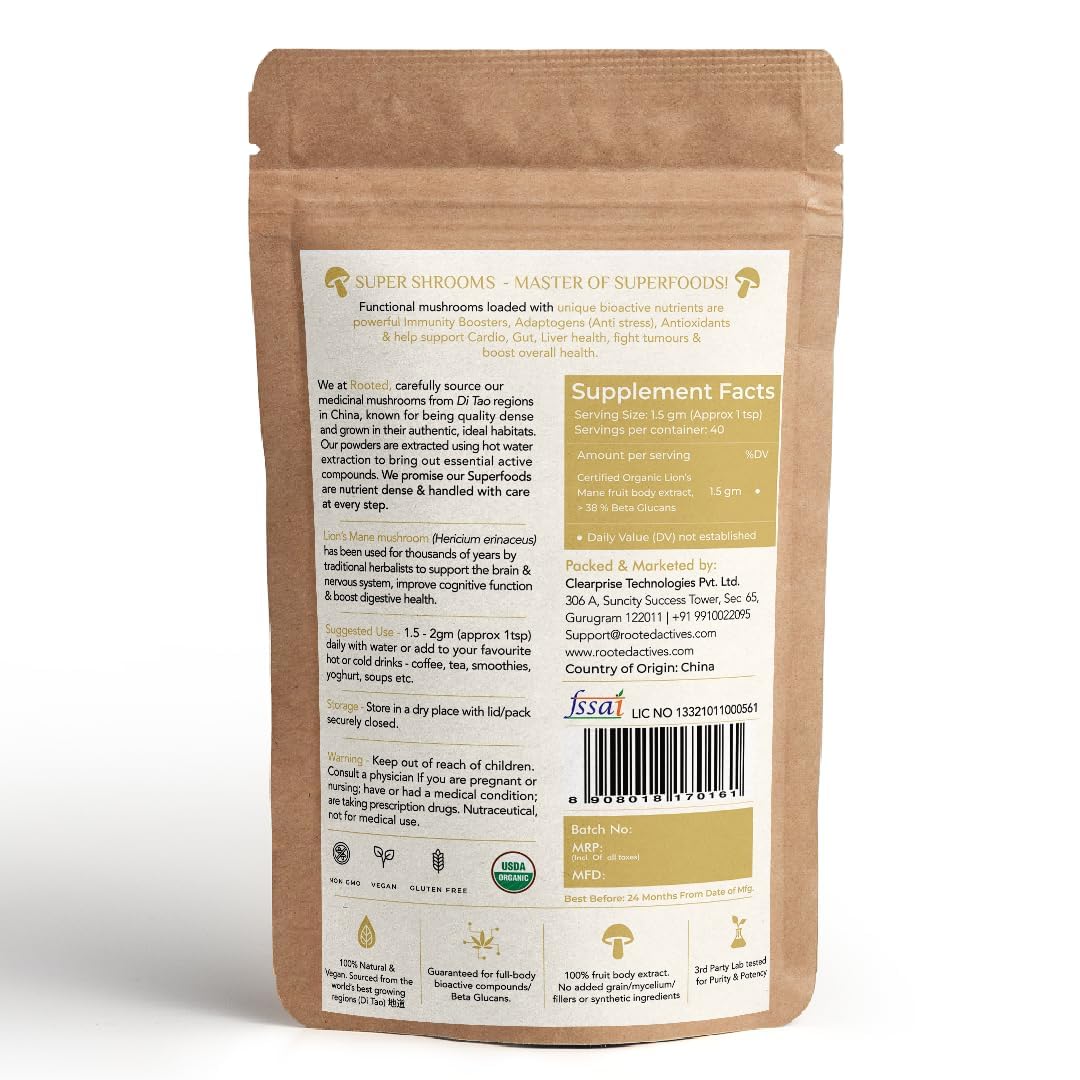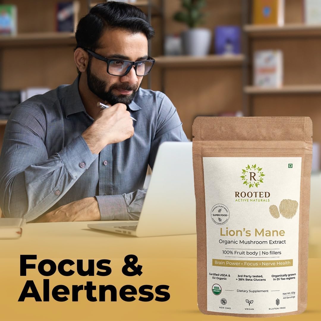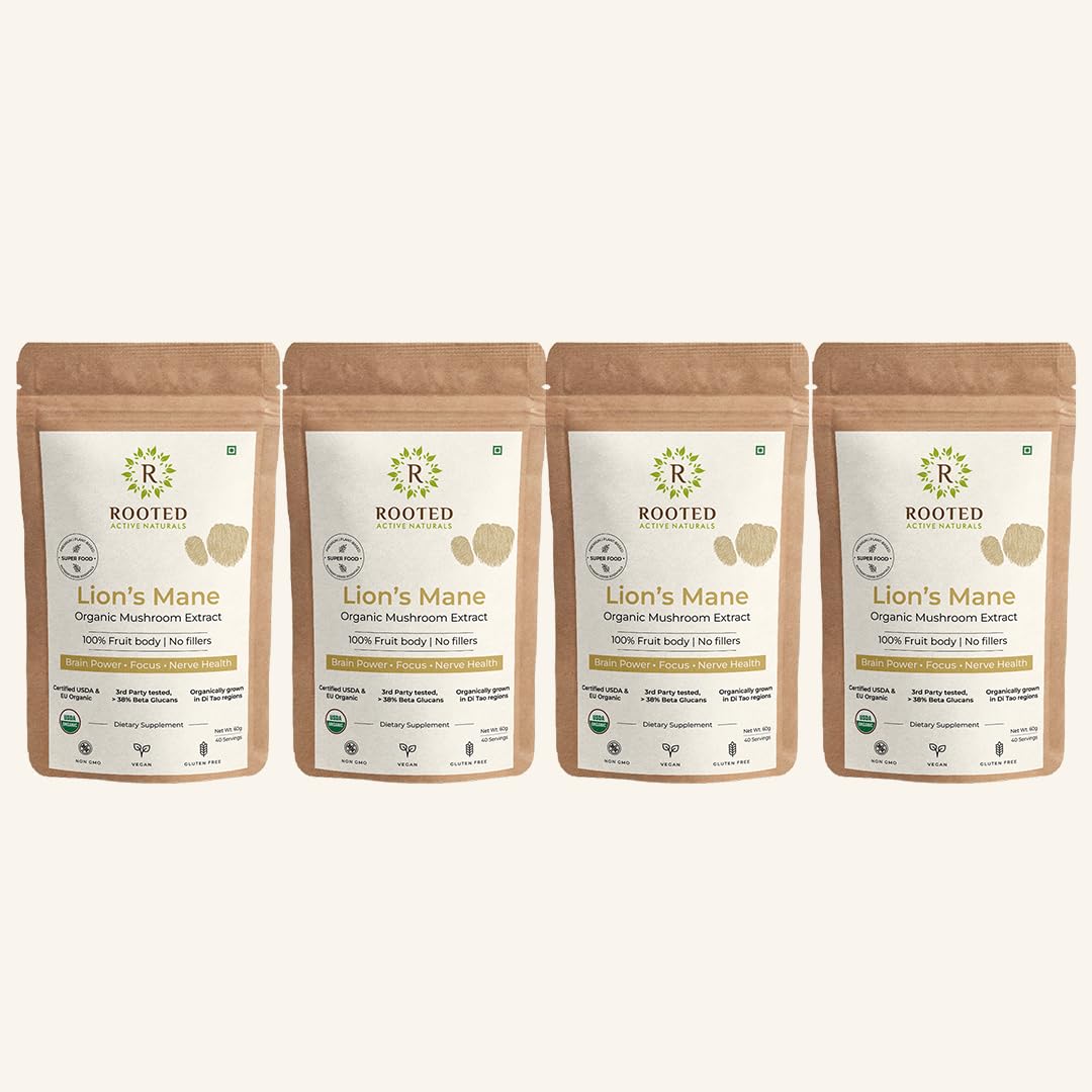 Rooted Active Lion Mane Mushroom Powder (Pack of 4 60g each) is a premium-quality mushroom powder made without artificial additives. This finely ground mushroom powder is ideal for mixing into smoothies coffee shakes or recipes offering a natural and convenient addition to your diet. This plant-based powder is carefully processed to retain its natural composition. It is vegan gluten-free and non-GMO making it suitable for those looking for a clean-label product.