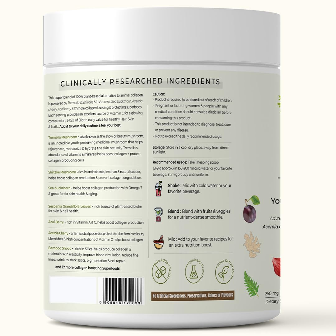 Rooted Actives Plant Based Collagen Supplement 250 G | Tremella Mushrooms Biotin Silica Vit C & 17 Beauty Boosters | No Sugar | Collagen Booster | Collagen Supplements For Women & Men