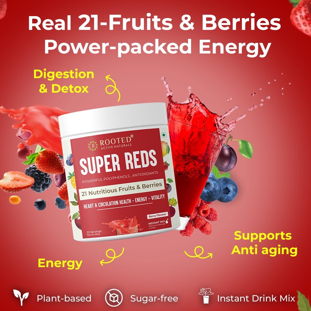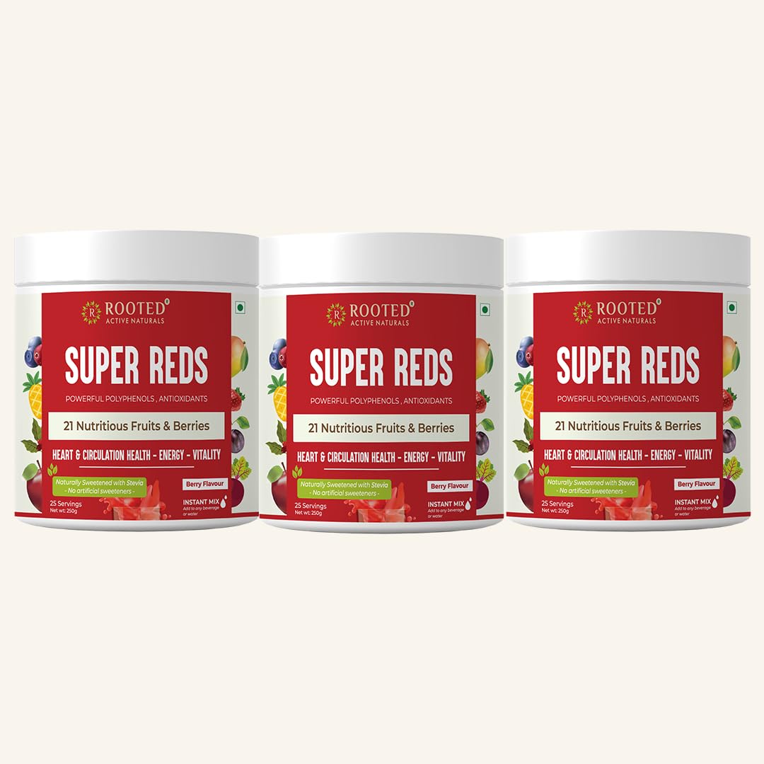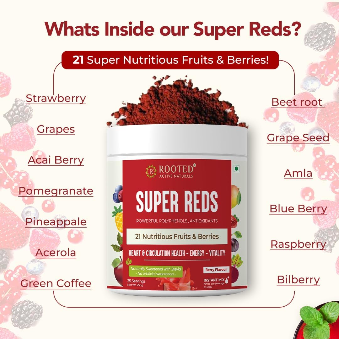 Rooted Actives Super Reds Powder (Pack of 3 250g each) is a flavorful blend of 21 nutrient-packed superfruits and berries including grapes raspberries beetroot strawberries acai berry pomegranate apple papaya and pineapple. This vegan non-GMO and gluten-free powder contains no artificial additives or added sugar making it an ideal addition to your daily nutrition routine. Enjoy the naturally delicious berry flavor by mixing it into water smoothies or shakes.