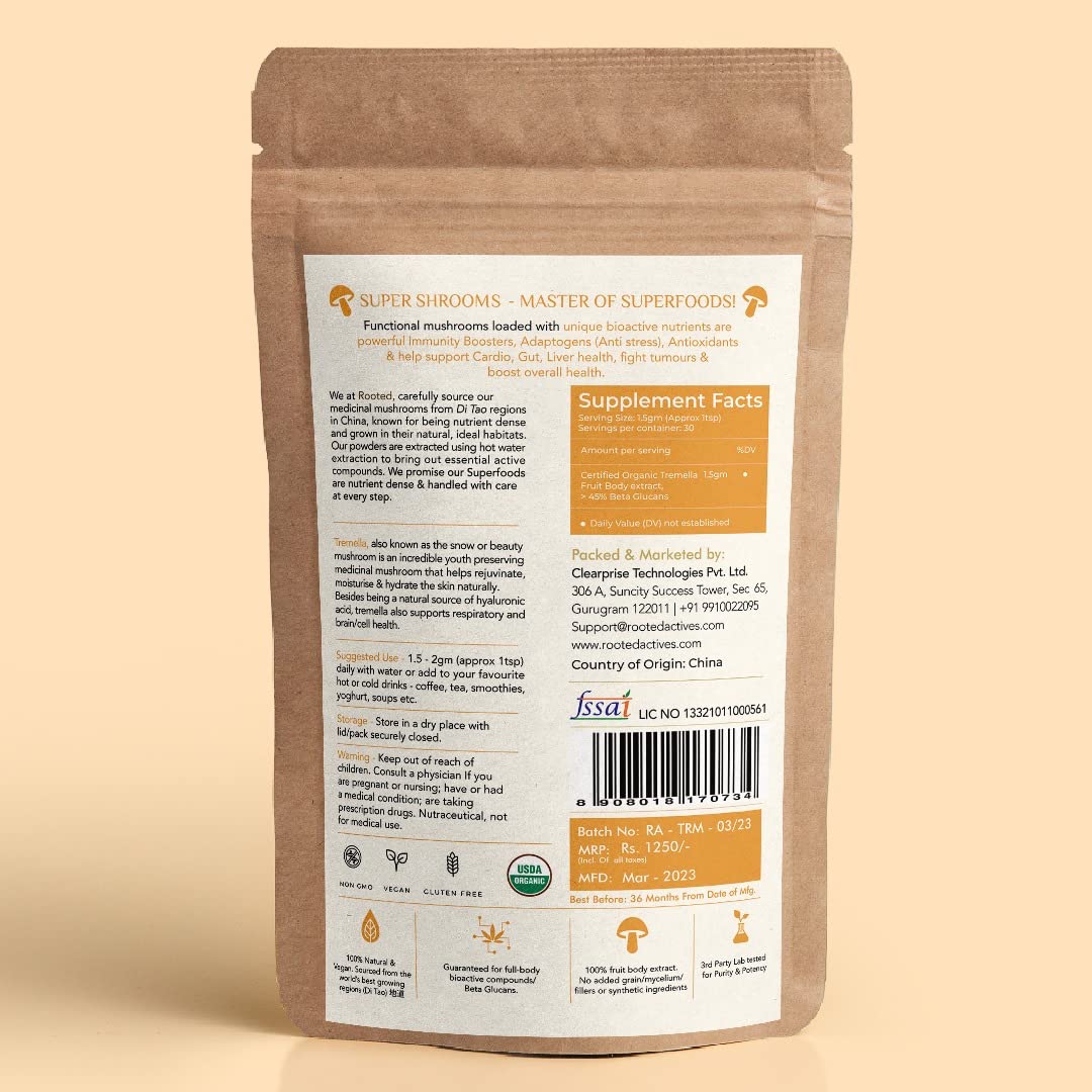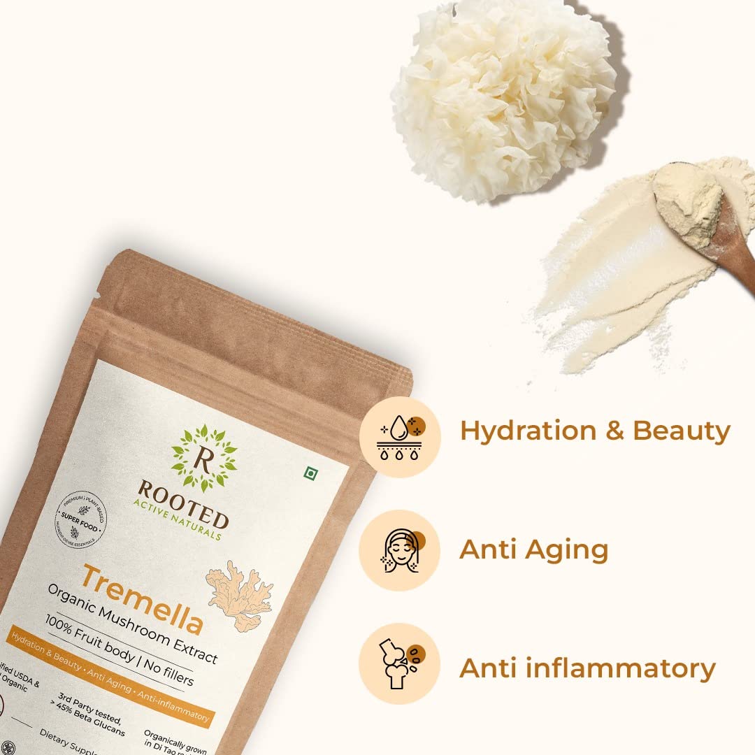 Rooted Actives Tremella Mushroom Extract (45 g) |Beauty Skin Glow Collagen booster Hyalyronic acid Hydration| USDA Organic 45% Beta Glucans