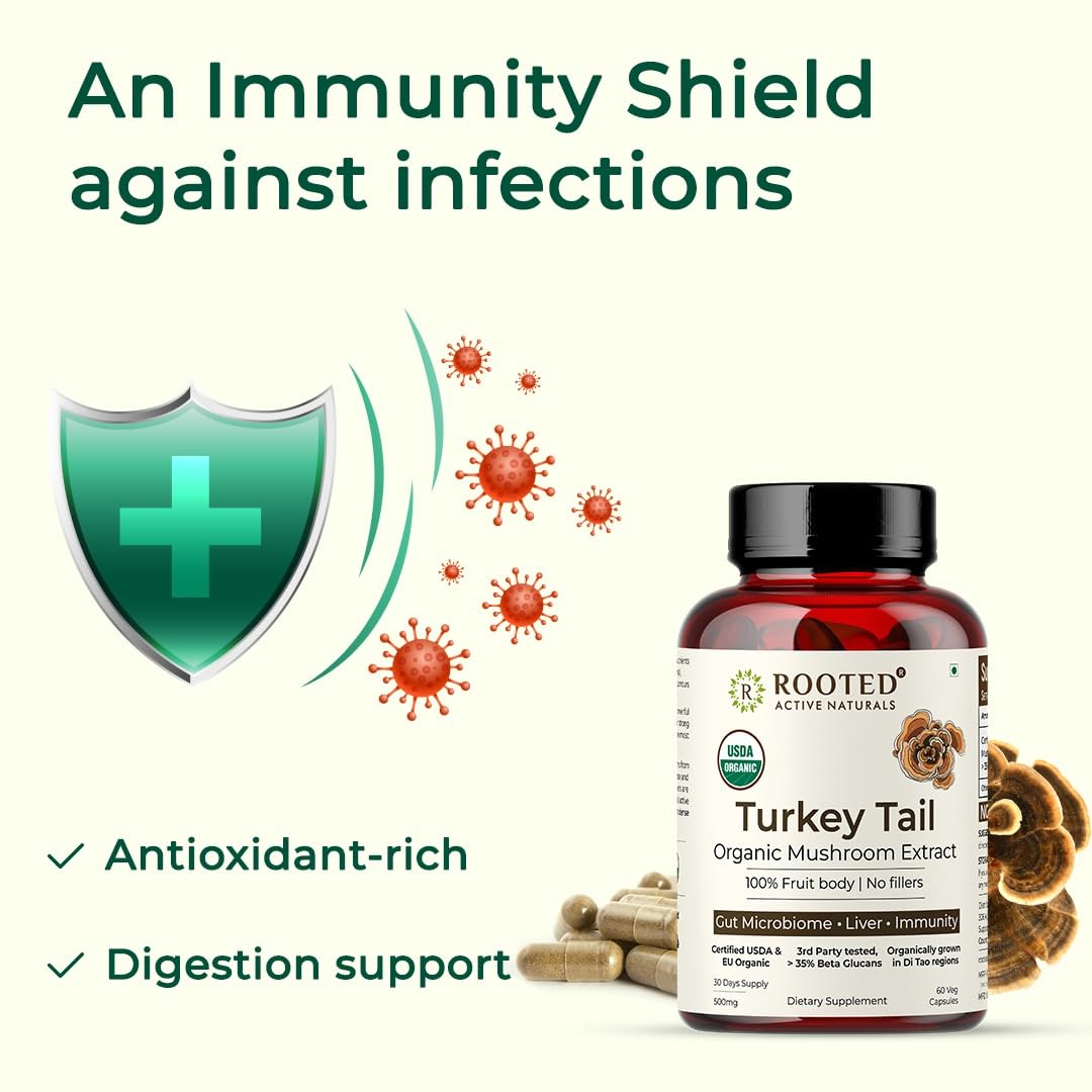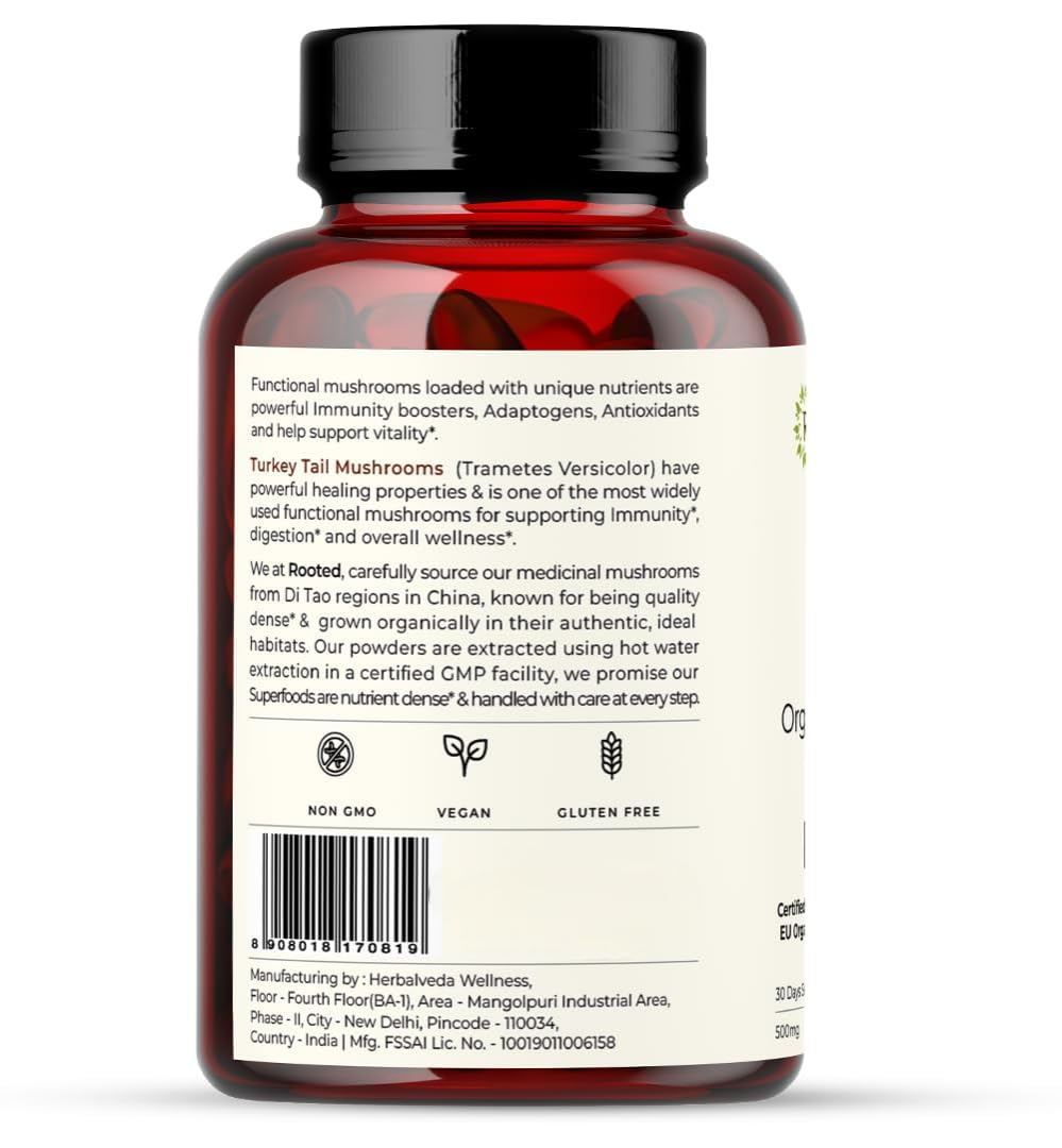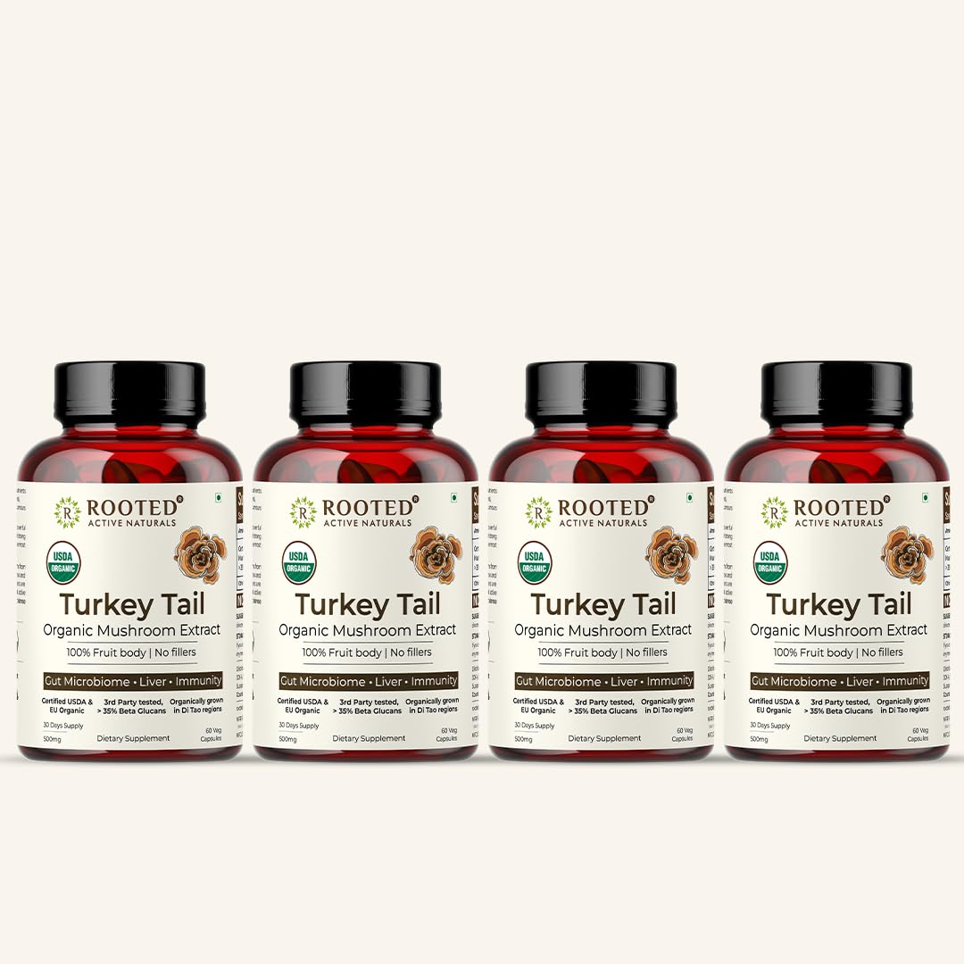 Rooted Active Turkey Tail Mushroom Capsules (Pack of 4 60 caps each) contain 100% whole mushroom powder carefully sourced and processed for quality. These vegan non-GMO and gluten-free capsules are free from artificial fillers or additives offering a clean-label choice. Designed for convenience these capsules require no mixing or brewingsimply take with water. The bulk pack of 4 provides great value and an extended supply for consistent use.