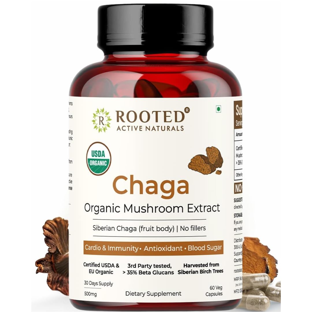 Rooted Active's Organic Chaga Capsules - Immune System Support Supplement Antioxidant Activity Support Regulate Body Functions Immune Support vegan Extract Dietary Mushroom Supplement (60 Caps)