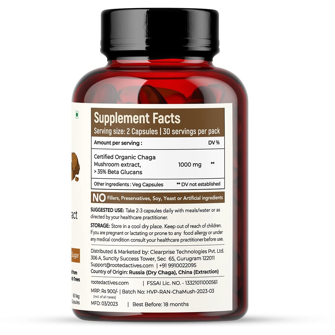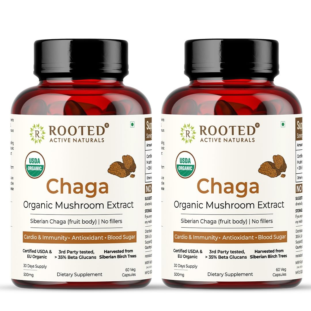 Rooted Actives Siberian Chaga Mushroom Capsules (60 Caps 500 Mg) | Blood Sugar Heart & Immunity | Usda Organic | 35% Beta Glucans | Pack Of 2